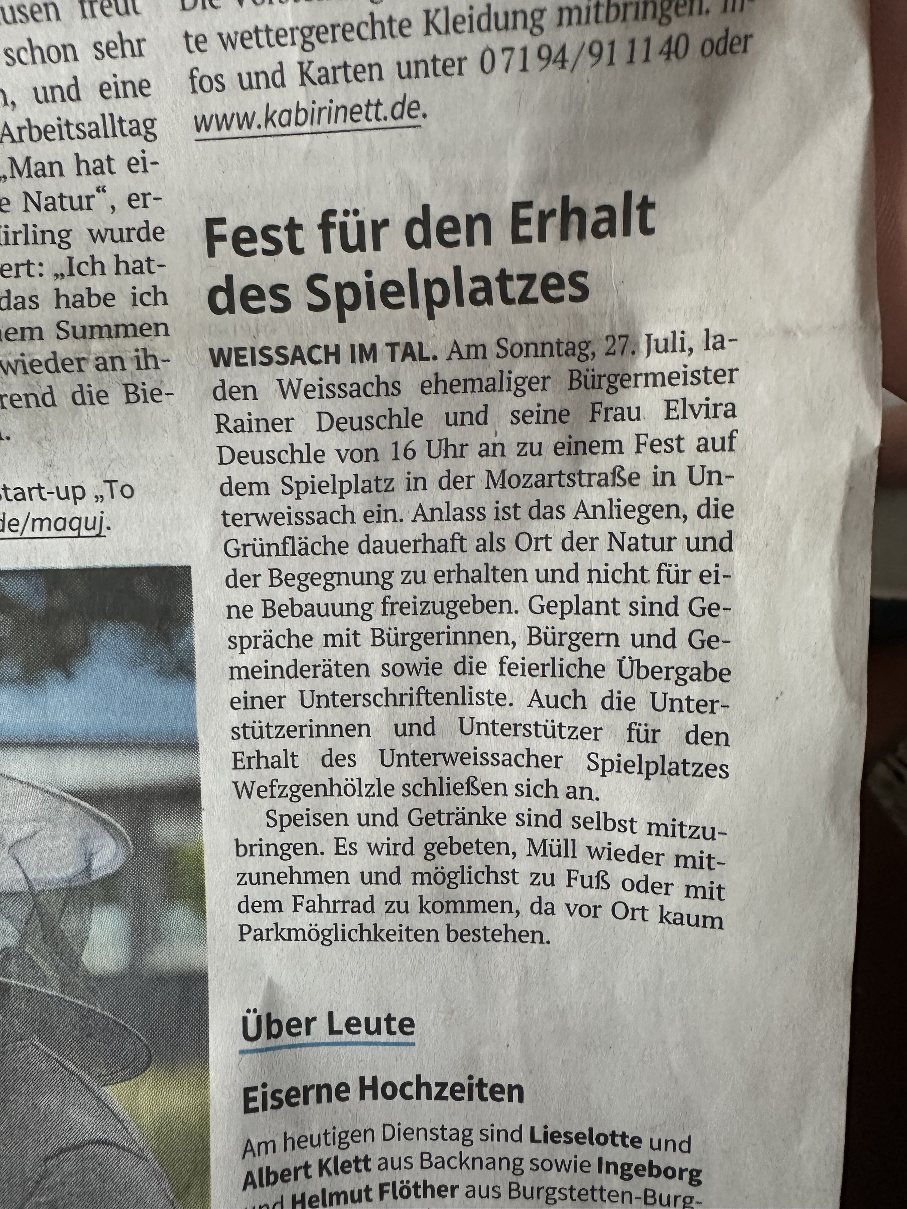 Alle Unterstützer der Weissacher Spielplätze sind herzlich auf die Gemeinderatsitzung in der Seniorenbegegnungsstätte um 18.00 Uhr eingeladen, um dort ihre Fragen zwecks der Mozartstrasse zu stellen. Alles was dort gerade passiert, wird auch das Wefzgenhölze betreffen.