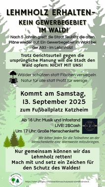Dazu laden wir euch herzlich ein und würden uns über zahlreiches kommen freuen, um ein weiteres Zeichen für den Erhalt unseres wertvollen Klimaschutzwaldes zu setzen.