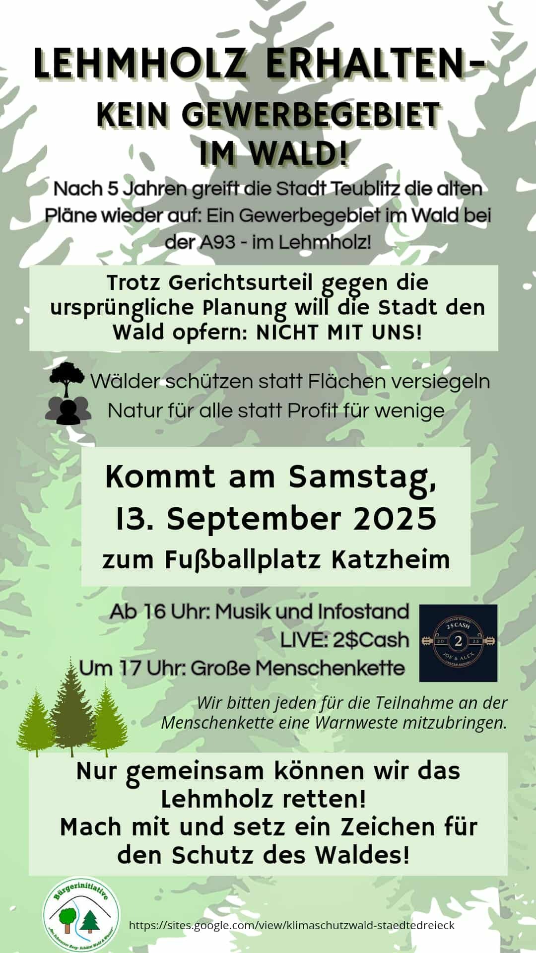 Unter dem Motto „Kein Verkauf von Staatswald an die Stadt Teublitz“ laden die beiden Bürgerinitiativen „Am Schwarzer Berg – Schützt Wald & Wasser“, sowie „Schützt unser Wasser – die BI im Städtedreieck“ zur Demonstration gegen das geplante Gewerbegebiet an der A93 ein.