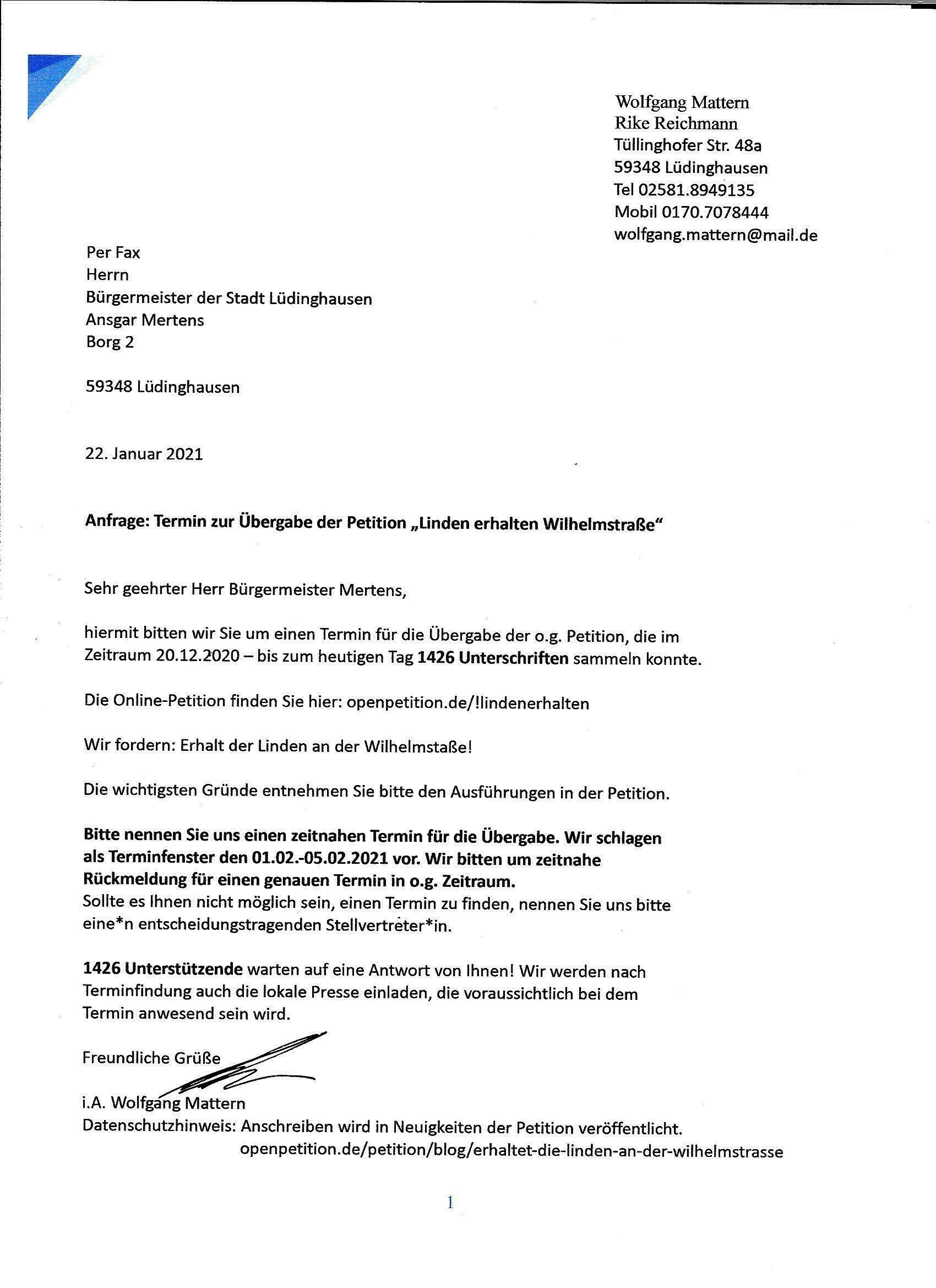Wir haben heute eine Terminanfrage zur Petitionsübergabe an den Bürgermeister der Stadt Lüdinghausen per Fax versandt.