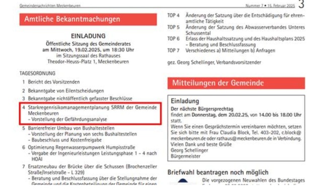 wie in der letzten Information bereits angekündigt, findet in der nächsten öffentlichen Sitzung des Gemeinderats (Mittwoch 08.02.2023, 17:30 Uhr im Sitzungssaal des Rathauses Meckenbeuren) unter TOP 7 eine Entscheidung zur Vergabe des Gutachtens zum Starkregenrisikomanagement statt - Details finden sich in der angehängten Beschlussvorlage und unter ris.meckenbeuren.de/termine.