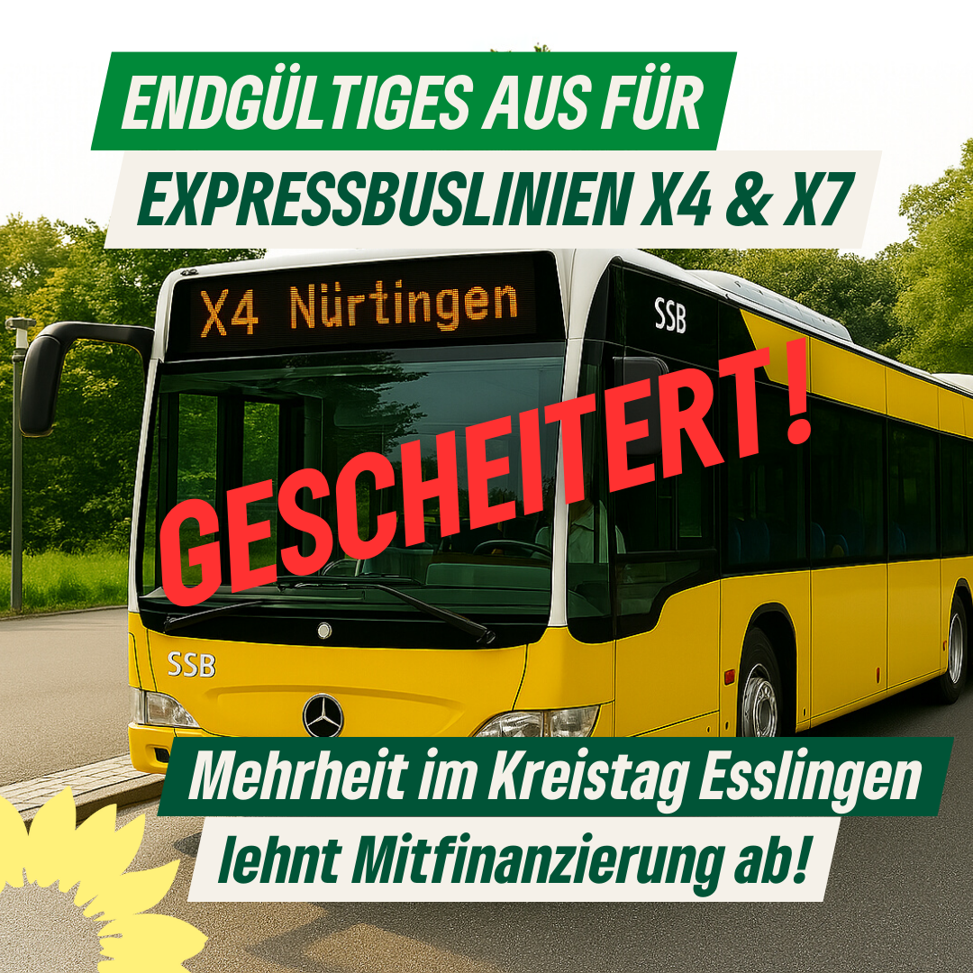 nachdem Filderstadt und Nürtingen bereits ihre finanzielle Unterstützung für den Erhalt von X4 und X7 in Aussicht gestellt hatten, hat die Mehrheit im Kreistag des Landkreises Esslingen nun leider erneut die Mitfinanzierung - dieses Mal einer kostensenkenden Variante - abgelehnt und damit das endgültige Aus dieser beiden Linien besiegelt. Der Betrieb wurde mit dem Fahrplanwechsel am 20. Dezember eingestellt.