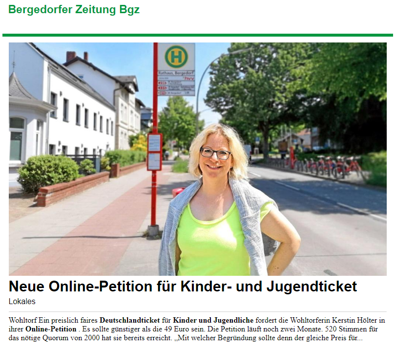Die Bergedorfer Zeitung hat am 7.6.2023 einen Artikel zur Petition veröffentlicht - ich hoffe, dass damit nun auch endlich andere Medien auf unser Anliegen aufmerksam werden: falls jemand einen Journalisten kennt, der sich dem Thema widmen würde, gerne Nachricht an mich senden (auf der Startseite der Petition: "Frage an Initiator" anklicken) - DANKE!