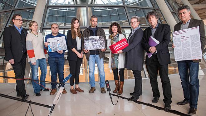 Mit dieser Pseudolösung wird das Leid vieler Familien nicht beendet, sondern um weitere Jahre verlängert. Wir beobachten, wie verzweifelt viele Menschen sind, die sich auf das Auslaufen der Aussetzung zum März 2018 verlassen hatten, so wie der Familienvater Hussein Mohamad, ein Kurde aus Syrien, der mit uns gemeinsam die Unterschriften übergeben hat: