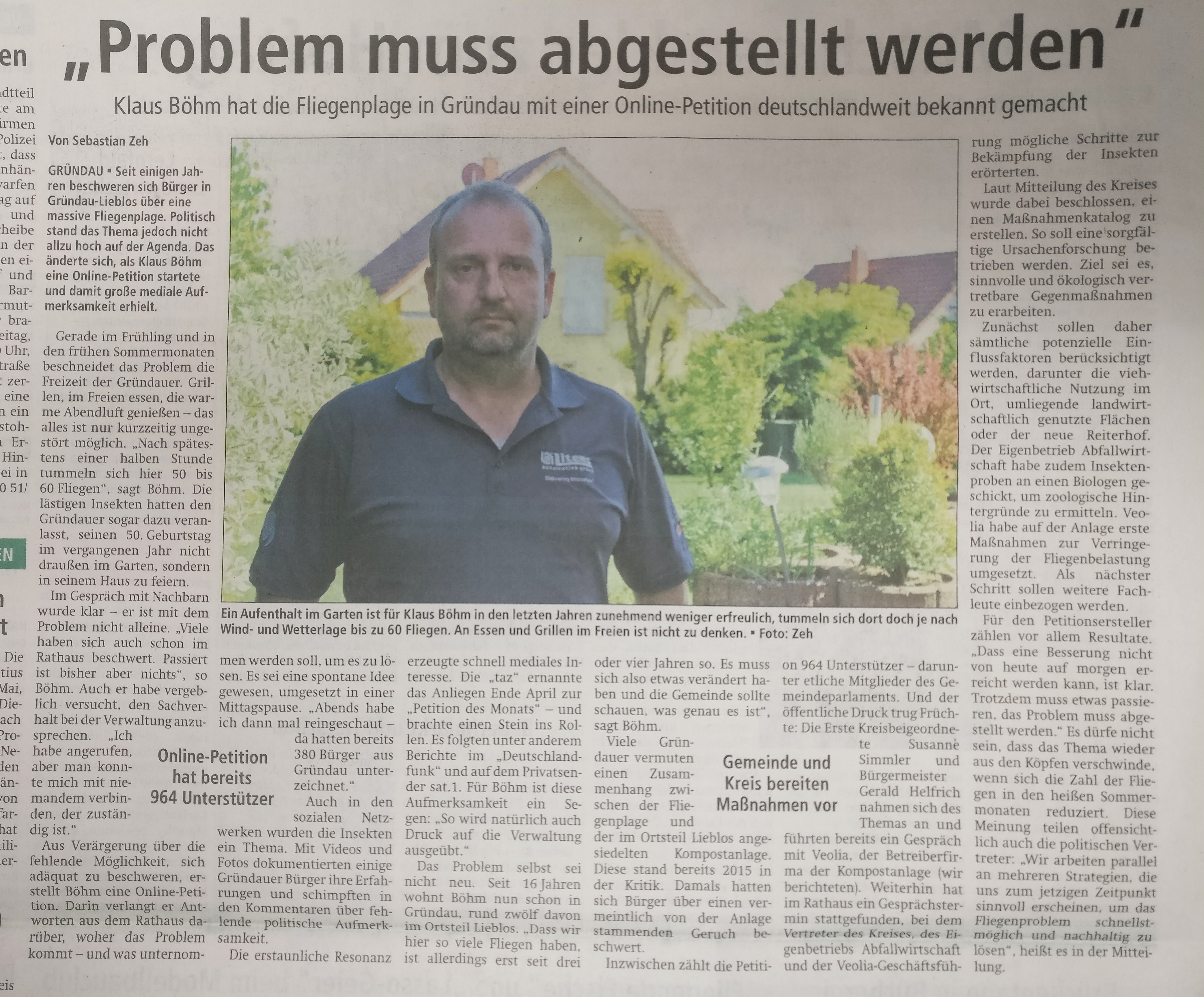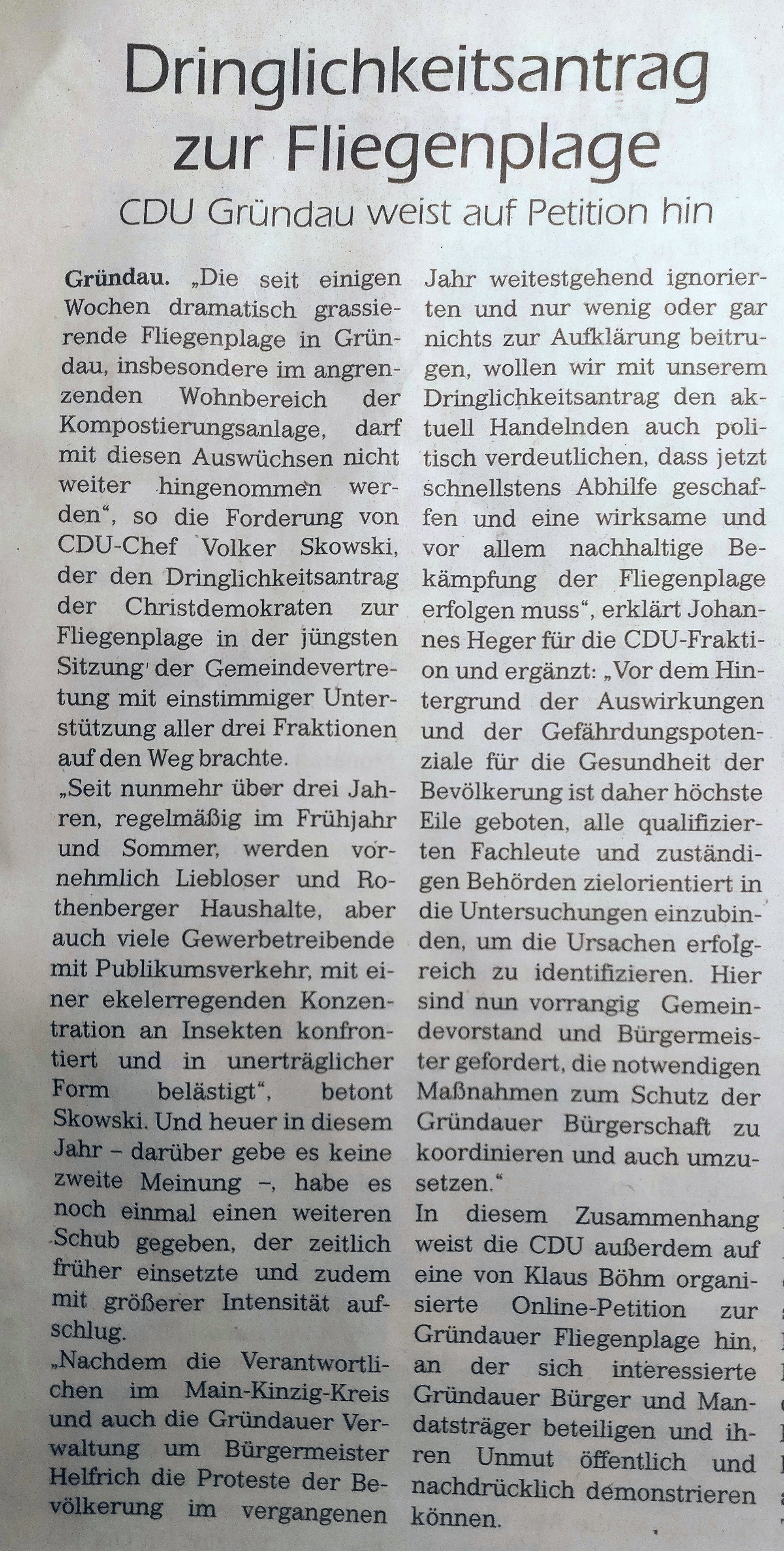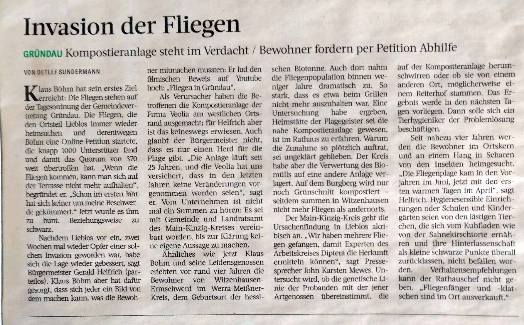 Gemeinde und Kreis haben bereits am 21.04. in der GNZ geäußert, das ein Biologe eingeschaltet wurde um eine Verwandschaft der Fliegen in den Ortschaften mit dem Vorkommen auf der Kompostierungsanlage zu untersuchen.