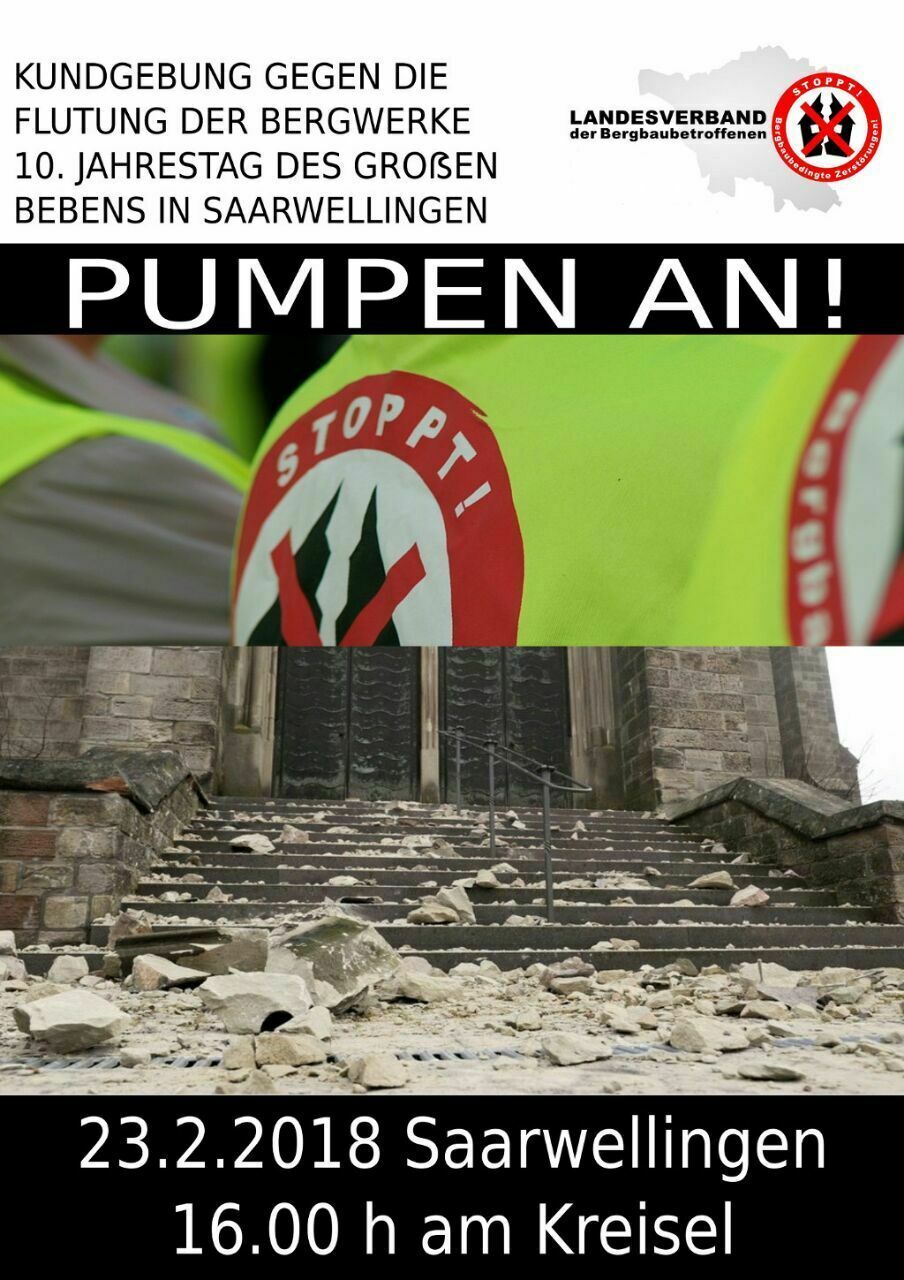Am kommenden Freitag 23.02.2018 treffen wir uns um 16:00 Uhr in Saarwellingen aus Anlass des zehnten Jahrestages des schweren Bebens zu einer Demo gegen die vollständige Flutung der Saargruben.