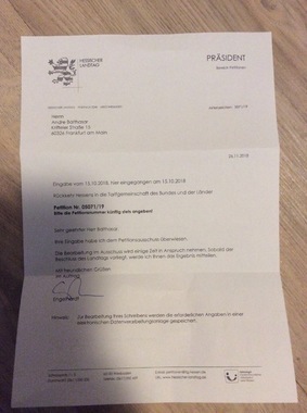 ....die Petition ist eingereicht und im Briefkasten des Landtages angekommen. Sobald der (neue) Landtag seine Stellungnahme abgibt, werde ich ohne schuldhafte Verzögerung nachberichten....