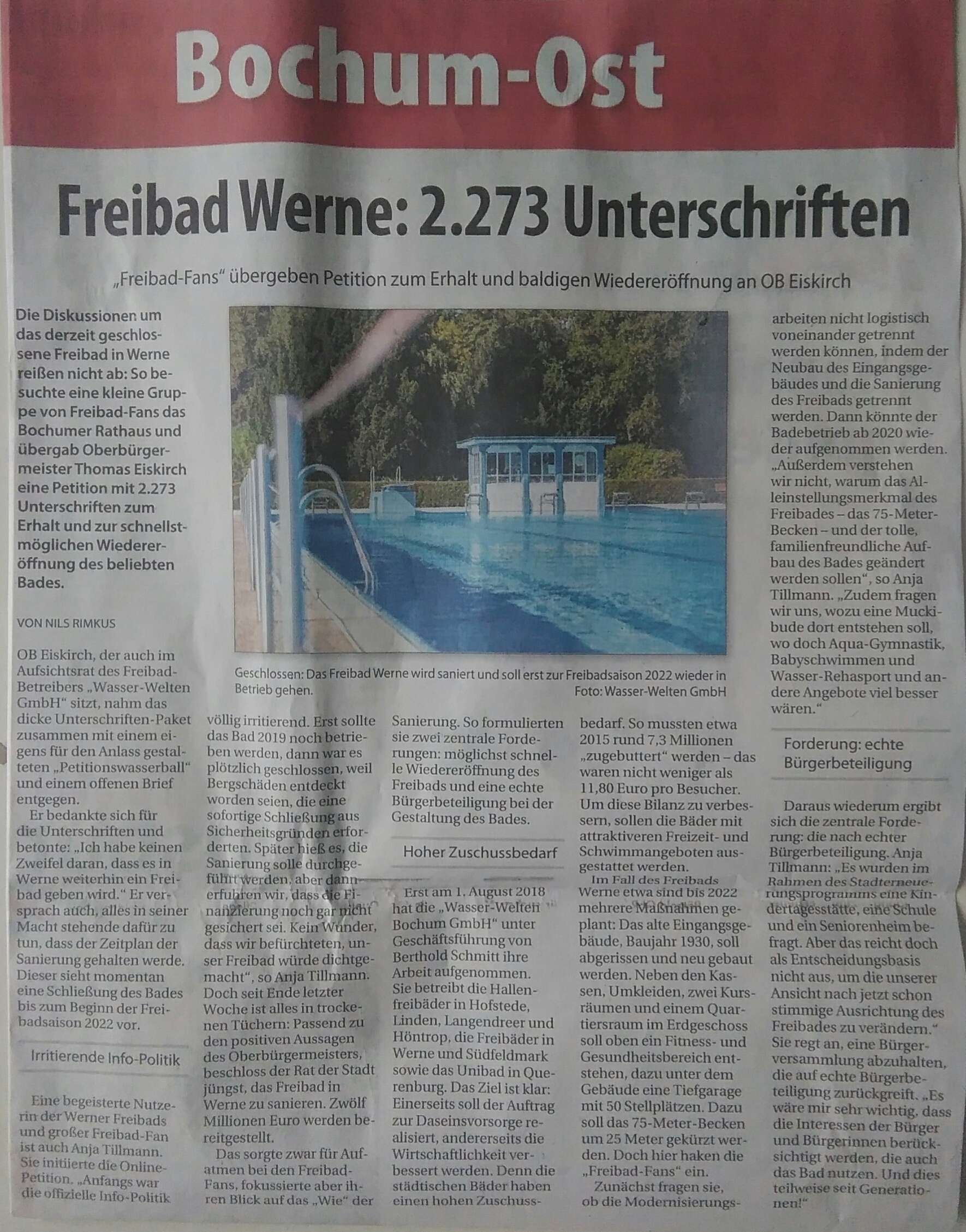 Wenn Sie/Ihr etwas tun wollt: Schreibt Briefe und Mails an unseren Oberbürgermeister Thomas Eiskirch (oberbuergermeister@bochum.de) oder an Herrn Schmitt, den Geschäftsführer der Wasserwelten (info@wasserwelten-bochum.de), in denen eine schnellstmögliche Wiedereröffnung und eine echte Bürgerbeteiligung bei den Sanierungsplänen für das Freibad Werne gefordert werden! Wieder einmal heißt es: Dranbleiben, aber daran sind wir ja langsam gewöhnt :-)