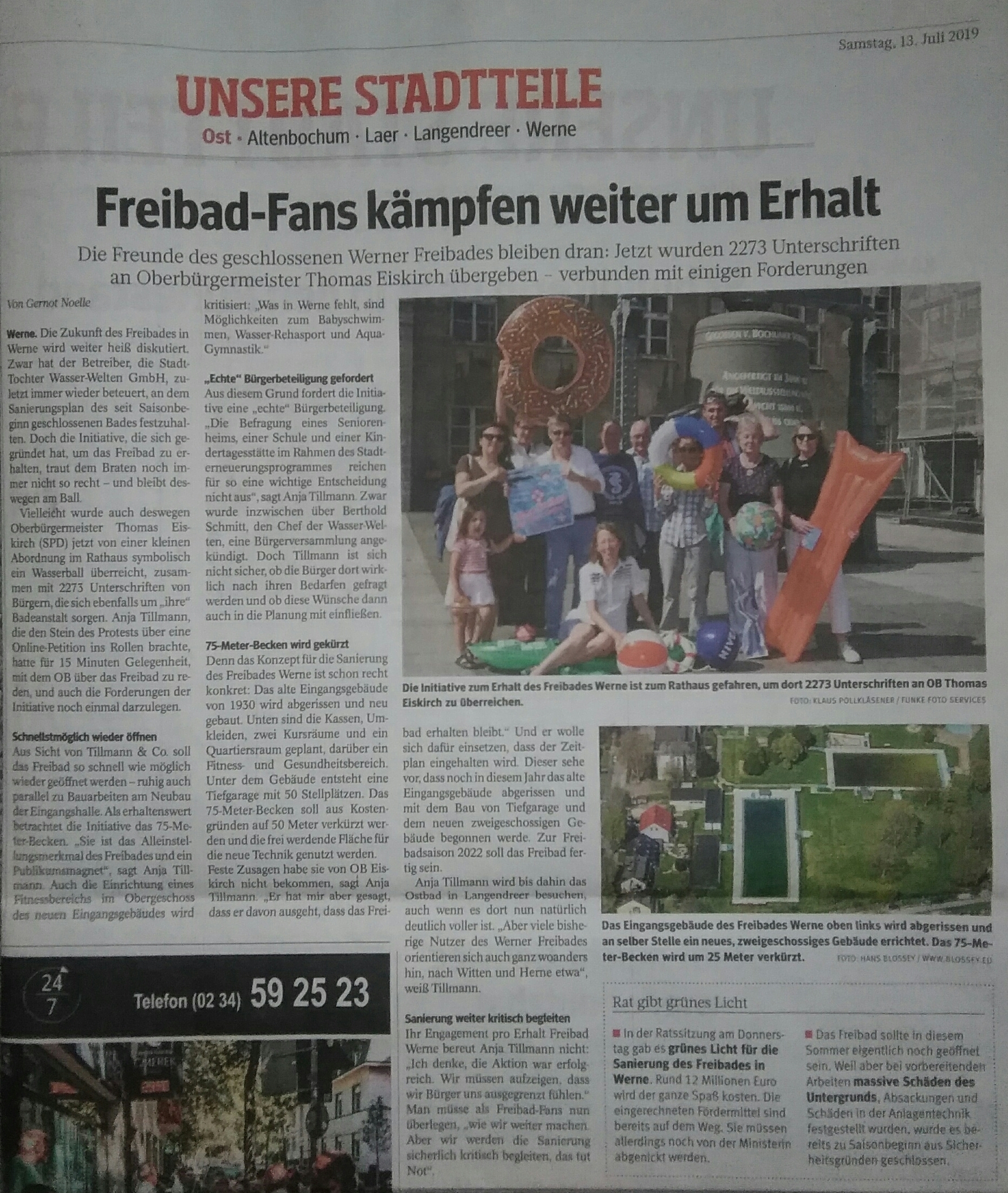 Zeit für eine Presseerklärung der Freibad-Fans Bochum Werne, dachten wir und haben kurz entschlossen eine verfasst und auf ihren Weg in Presse und Politik gebrach. Den Text der Presseerklärung ebenso wie den WAZ-Artikel gibt es hier (eventuell ein bisschen runterscrollen):