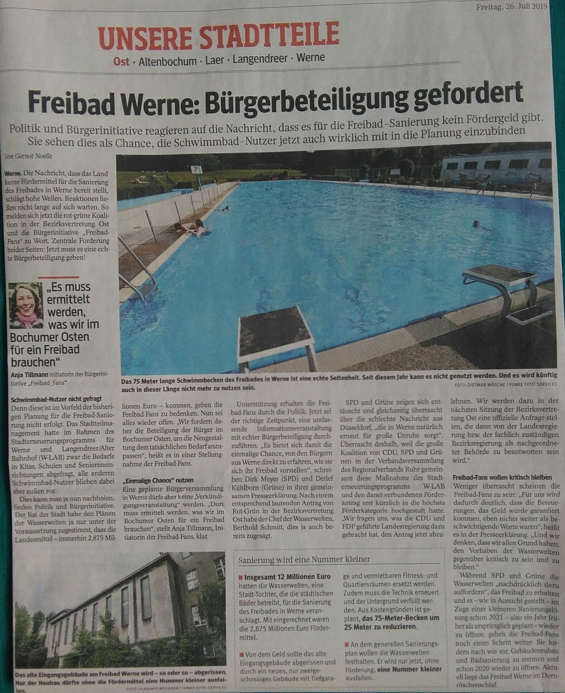 durch die Presseerklärung zu den ausgebliebenen Fördermitteln ist es uns gelungen, einiges an Aufmerksamkeit für das Freibad Bochum Werne zu erzeugen - danke noch mal an alle, die mitgedacht und mitgemacht haben! :-)