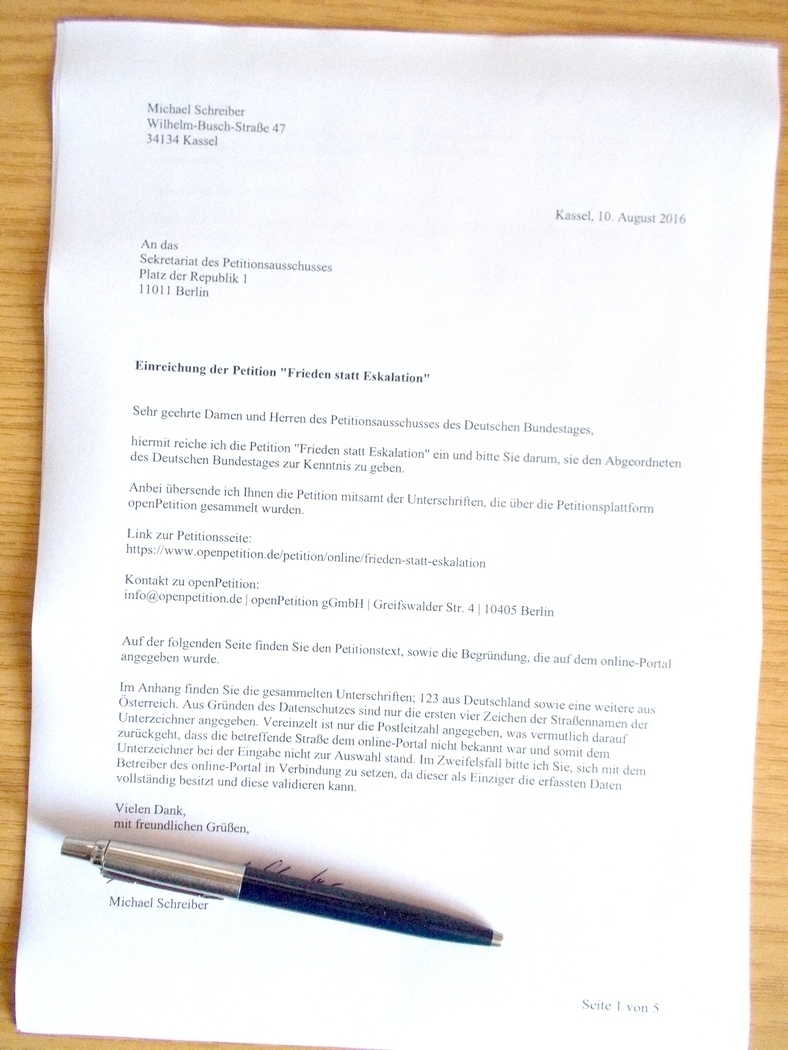 die Petition "Frieden statt Eskalation" ist heute auf dem Weg zum Petitionsausschuss des Deutschen Bundestages.