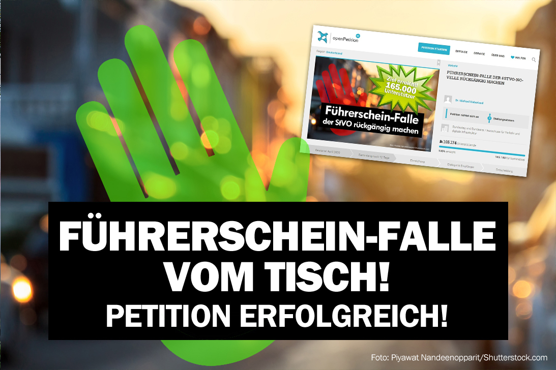 es gibt einen Grund zu feiern! Am Freitag, den 16. April, wurde unsere Petition „Führerscheinfalle der StVO-Novelle rückgängig machen“ von Erfolg gekrönt! Wir möchten uns daher ganz herzlich bei Ihnen für Ihre Unterstützung bedanken. Ohne die 165.000 Unterschriften hätten wir den Druck auf die Politik nicht ausüben können. Und ich wage mich jetzt einmal weit aus dem Fenster, ohne uns und diese 165.000 Unterschriften wäre das auch nicht geschehen. Daher DANKE! an Euch!