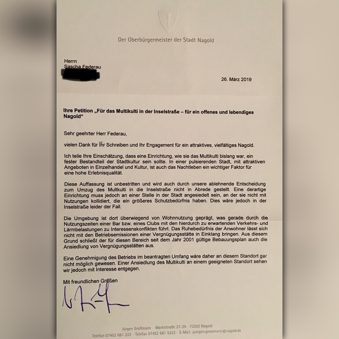 Auch wenn es der OB nicht direkt anspricht, so wurde der Umzug des Multikulti nicht genehmigt ("... wäre daher an diesem Standort gar nicht möglich gewesen."). Interessant ist die Argumentation: es gibt de facto keine. Er spricht zwar von "Betriebsemissionen", die mit dem Ruhebedürfnis der Anwohner kollidieren, dem steht aber ein Gutachten gegenüber, welches für den neuen Standort des Multikulti erstellt wurde und dem Autor dieser Petition vorliegt.