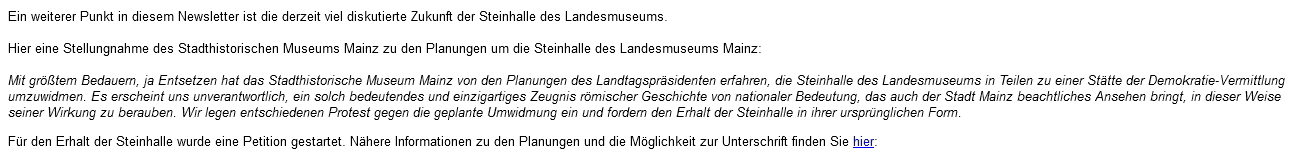 Das Stadtmuseum Mainz hat in seinem aktuellen Newsletter zu den Planungen des Landtagspräsidenten zur Steinhalle des Landesmuseums Mainz Stellung genommen.