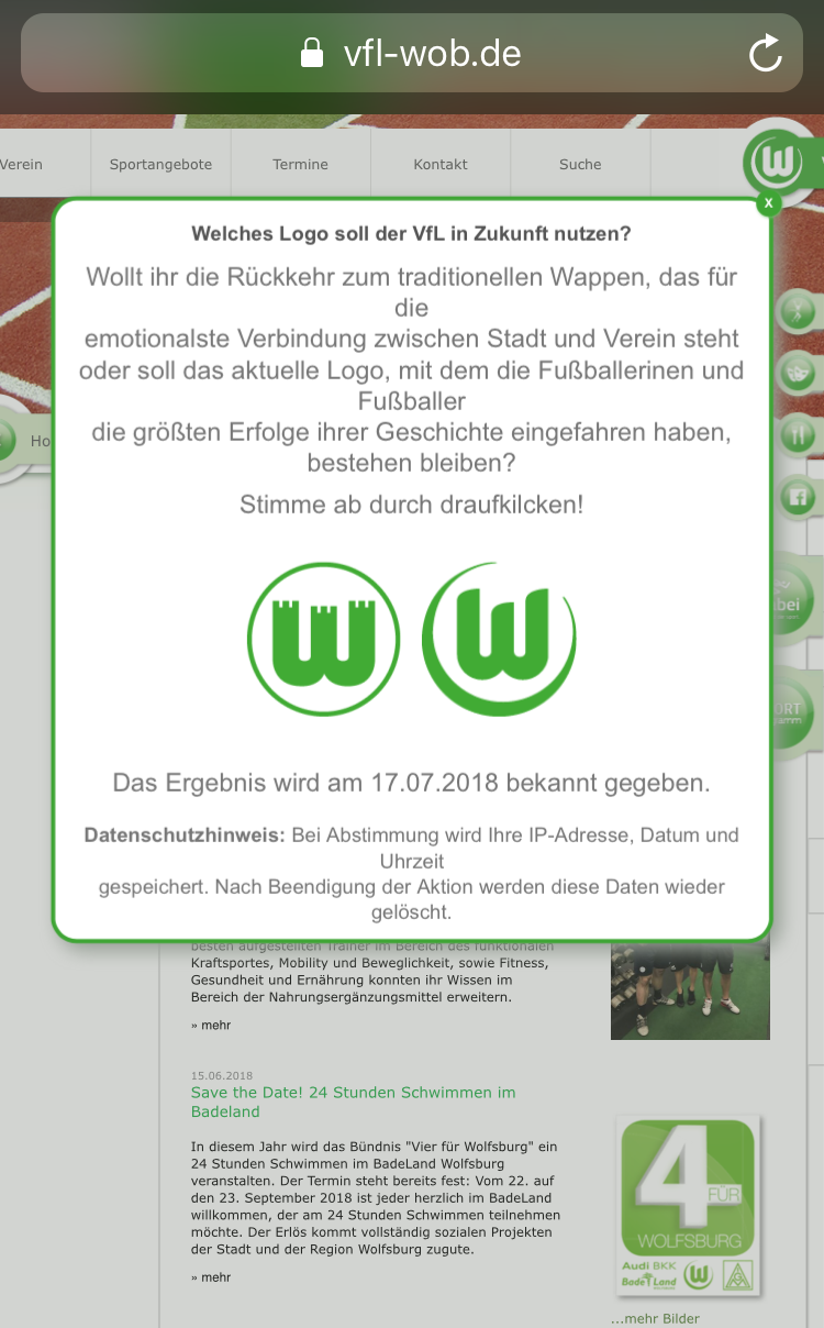 Auf seiner Homepage lässt der VfL Wolfsburg e.V. bis zum 17.07.2018 abstimmen, ob zukünftig wieder das Zinnenwappen genutzt werden soll. Ihr könnt euch unter folgendem Link an der Umfrage beteiligen: