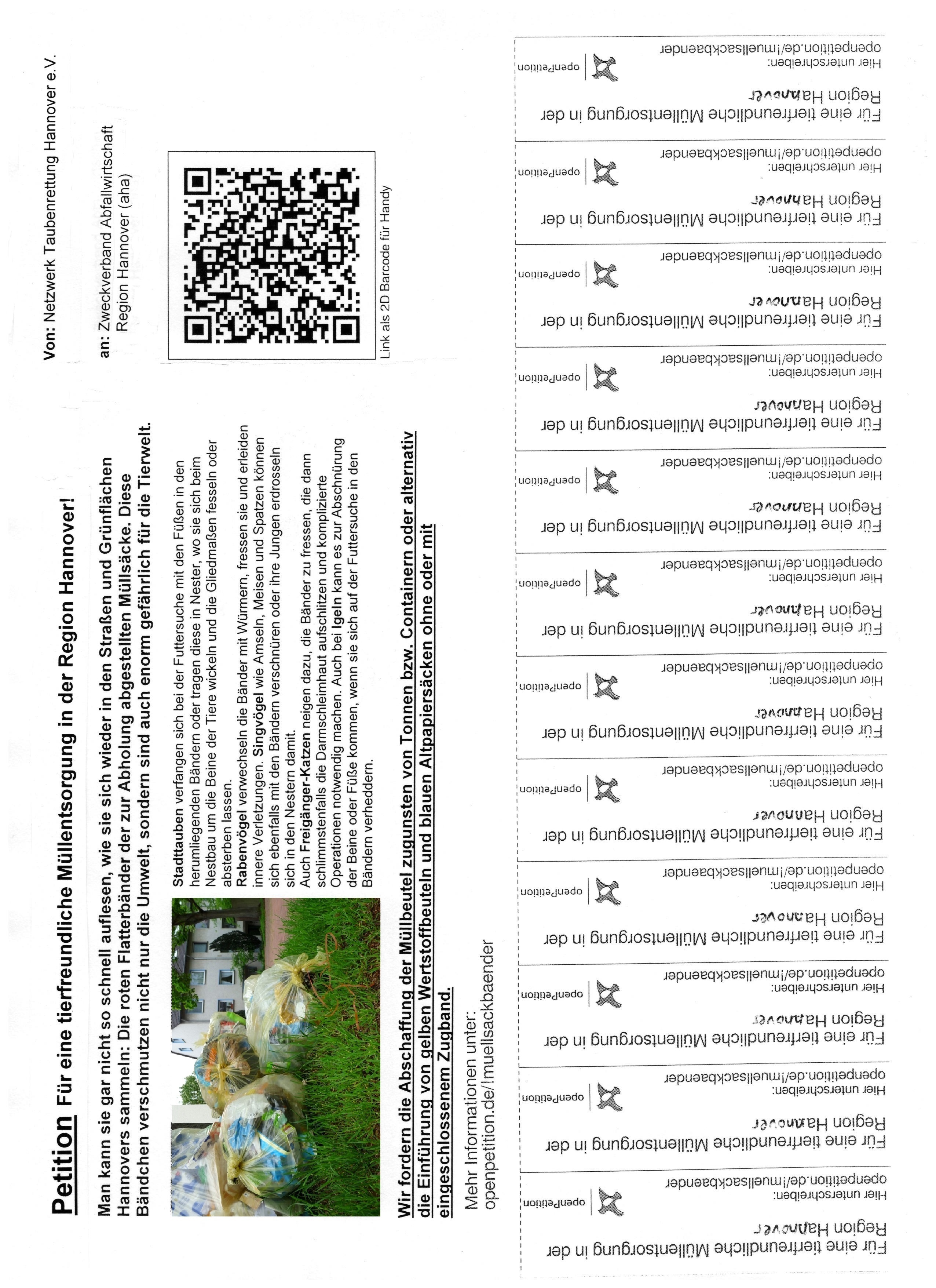 Da es sich um ein lokales Anliegen handelt, sind Aushänge ein gutes Mittel, um Hannoveraner*innen auf die Petition aufmerksam zu machen. Anbei findet ihr einen Entwurf zum Ausdrucken und Aushängen in Tierarztpraxen, Zoogeschäften, Supermärkten etc... Danke für eure Hilfe!