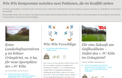 Win-Win Kompromissvorschläge die dann jeweils von beiden Seiten bewertet und kommentiert werden können.