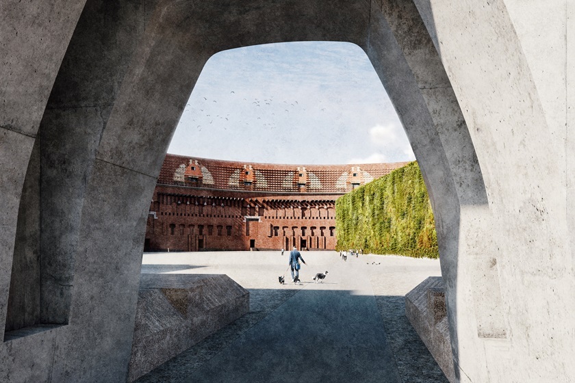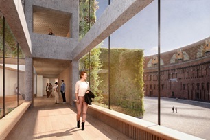 Zukünftiger Blick in den Innenhof: Erst auf den zweiten Blick wird der Theaterbau in seiner Gesamtheit sichtbar. Visualisierung Eingang Torso Zukünftiger Blick in den Innenhof: Foto: Reisch GmbH & Co