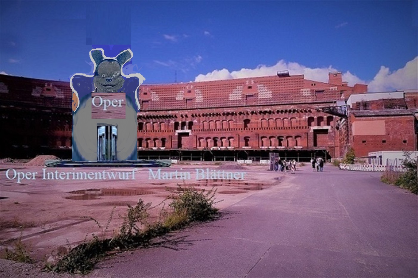 Die Stadt ist sich sehr sicher, dass am 17.Juli positiv über das Opern-Interim in einer nichtöffentlichen Sitzung entschieden wird, denn erst anschließend wird sie den den ausgewählten Entwurf für den Ergänzungsbau (um 12.45 Uhr) vorstellen, also erst nach der Abstimmung. Vermutlich wird er wie eine graue Opernmaus aussehen. Digitale Collage Blättner