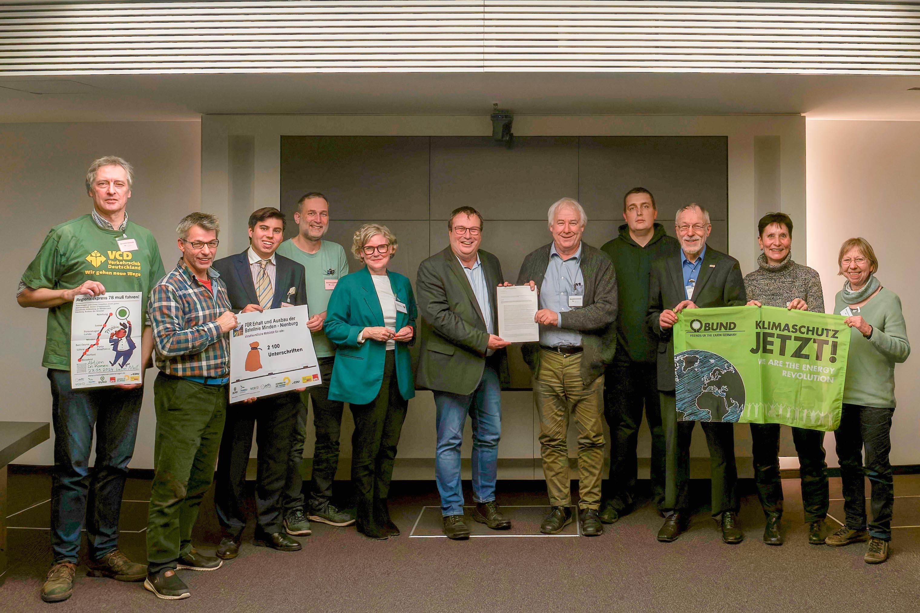Am 16.12.2024 übergaben wir, die InitiatorInnen der Petition für den Erhalt und Ausbau der Strecke des RE78 Minden – Nienburg, die Kreisverbände NABU, BUND, ADFC und VCD sowie weitere VertreterInnen der Verkehrswende Petershagen von Grünen und CDU, Verkehrsminister Oliver Krischer im Beisein von Mitarbeitern seines Ministeriums und der stellvertretenden Geschäftsführerin des Nahverkehrsverbundes Westfalen (NWL) Frau Christiane Auffermann die über 2100 Unterschriften unserer erfolgreichen Petition.