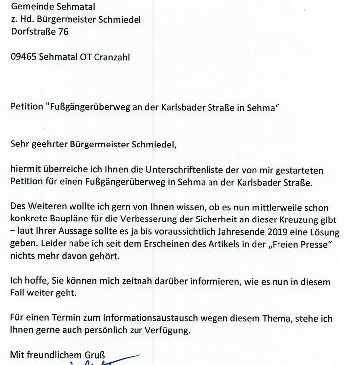 nachdem die Petition eingereicht war bekam ich vom Bürgermeister, Herrn Schmiedel, einen Anruf. In dem Telefonat wurde ein Termin zu einem gemeinsamen Gespräch vereinbart, dieser Tag war - zum Glück trotz Corona - heute.