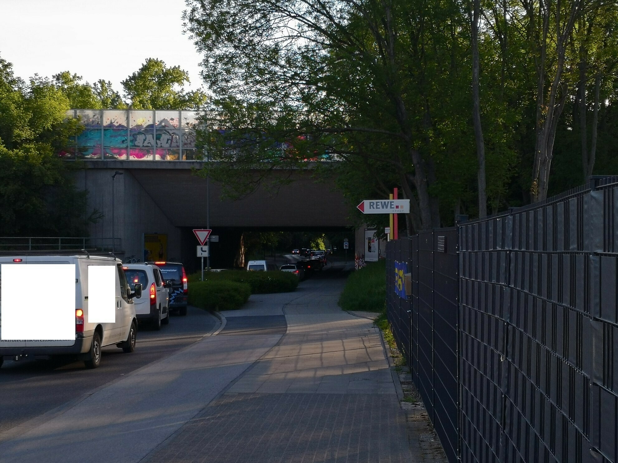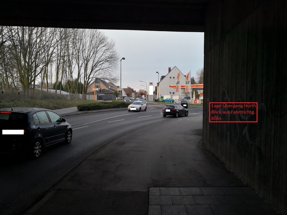 Der direkt in der Kurve an der Unterführung gelegene, ursprünglich vorgesehene Fußgängerübergang wurde von der Stadt Hürth zurückgebaut und durch ein Warnschild vor kreuzenden Fußgängern ersetzt. Jetzt hat man gekennzeichnet. Man hier die Verantwortung vom Autofahrer auf den Fußgänger übertragen und eine weitere Hürde an der Gefahrenstelle geschaffen. übertragen, Ohnehin wurde wird dieser ehemalige Übergang wegen seiner gefährlichen Lage meistens gemieden, da Fahrzeuge oft sehr schnell aus der Unterführung rasen und man als Fußgänger wegen der uneinsehbaren Kurve nicht rechtzeitig erkannt wird.