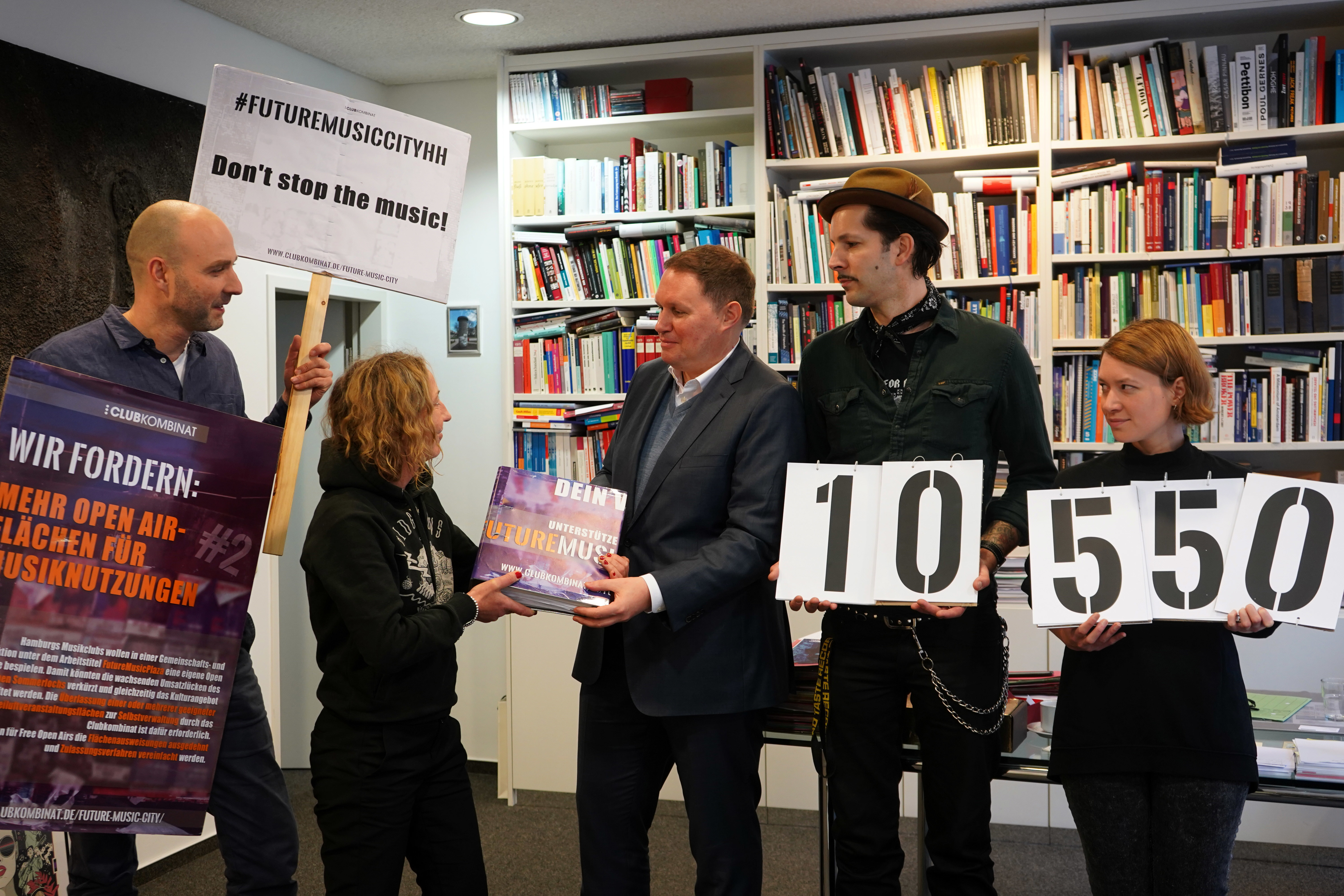 Kultursenator Dr. Carsten Brosda empfing diese Unterschriftensammlung vor zwei Wochen aus den Händen der Vorstände des Clubkombinats stellvertretend für den Ersten Bürgermeister Peter Tschentscher, der nach Stellungnahme der Senatskanzlei grundsätzlich keine Unterschriften entgegennimmt.