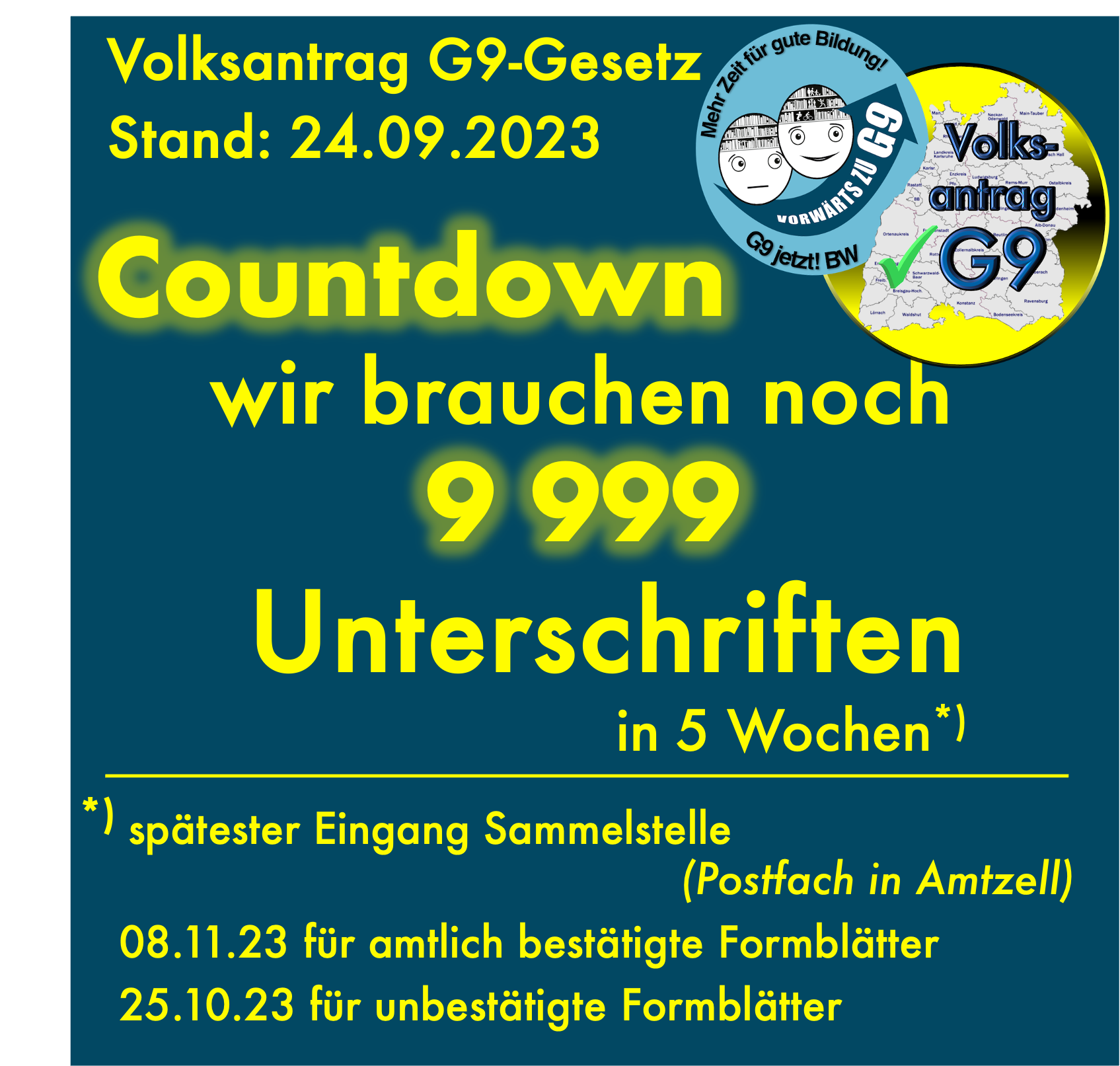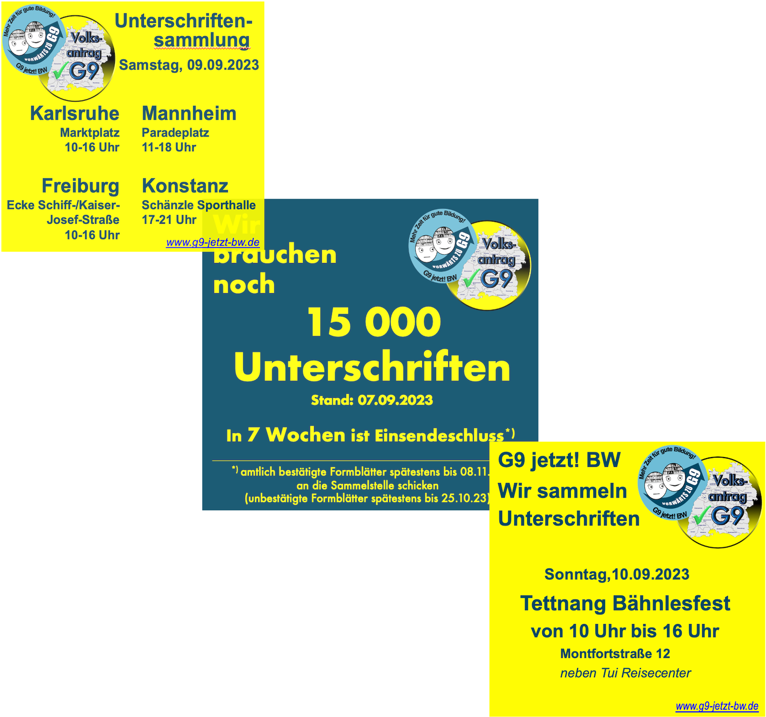 Bereits dieses Wochenende starten wir nochmals so richtig durch: Am 9.9. sind es noch 9 Wochen bis zur Abgabe des Volksantrages G9-Gesetz in Stuttgart – dieses magische Datum werden wir für Unterschriftensammlungen an vielen Orten in Baden-Württemberg nutzen.