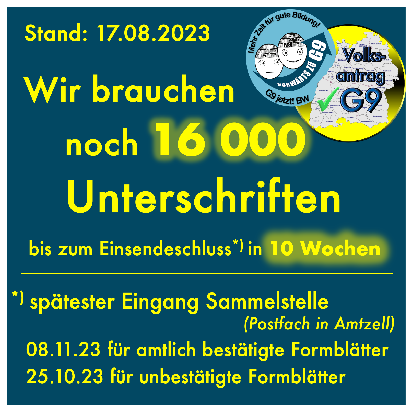 WIR KÖNNEN ES WEITERHIN SCHAFFEN, DEN ERSTEN VOLKSANTRAG IN DER GESCHICHTE BADEN-WÜRTTEMBERGS MIT EINEM ERFÜLLTEN QUORUM DURCHZUBEKOMMEN UND DAMIT DEN LANDTAG ZU ZWINGEN, SICH MIT DEM G9-GESETZENTWURF AUSEINANDERZUSETZEN – FÜR UNSERE KINDER!