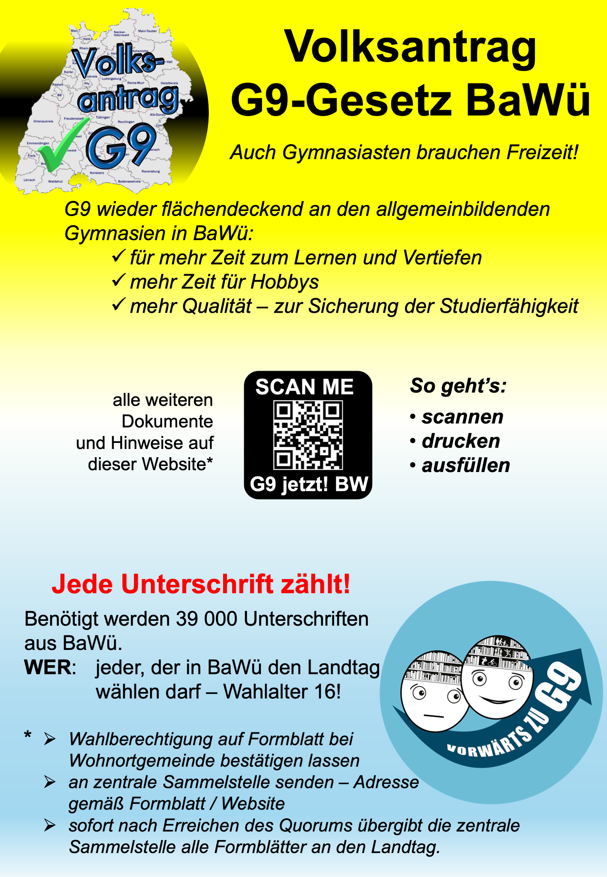 Seit dem 12.11.2022 dürfen Wahlberechtigte (ab 16 Jahren!) den Volksantrag mit Gesetzentwurf (G9-Gesetz) unterschreiben!
