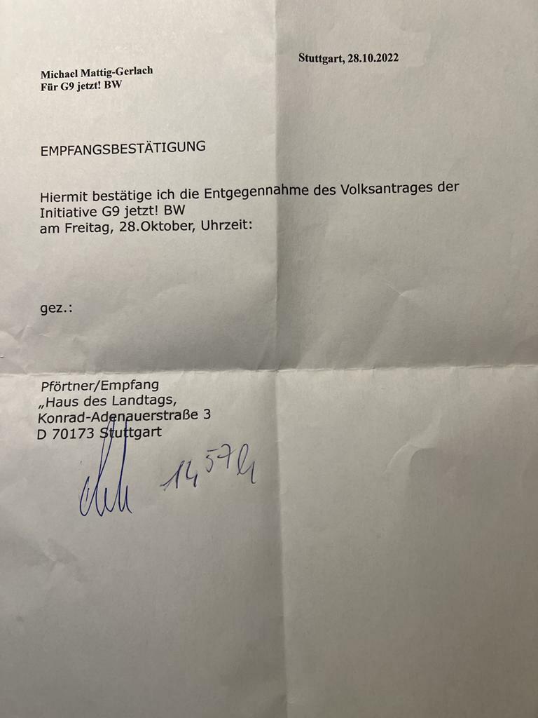 Wenn 39 000 Menschen den Volksantrag – händisch auf dem vorgegebenen Formblatt – unterschrieben haben, MUSS sich der Landtag mit dem Thema G9 beschäftigen.
