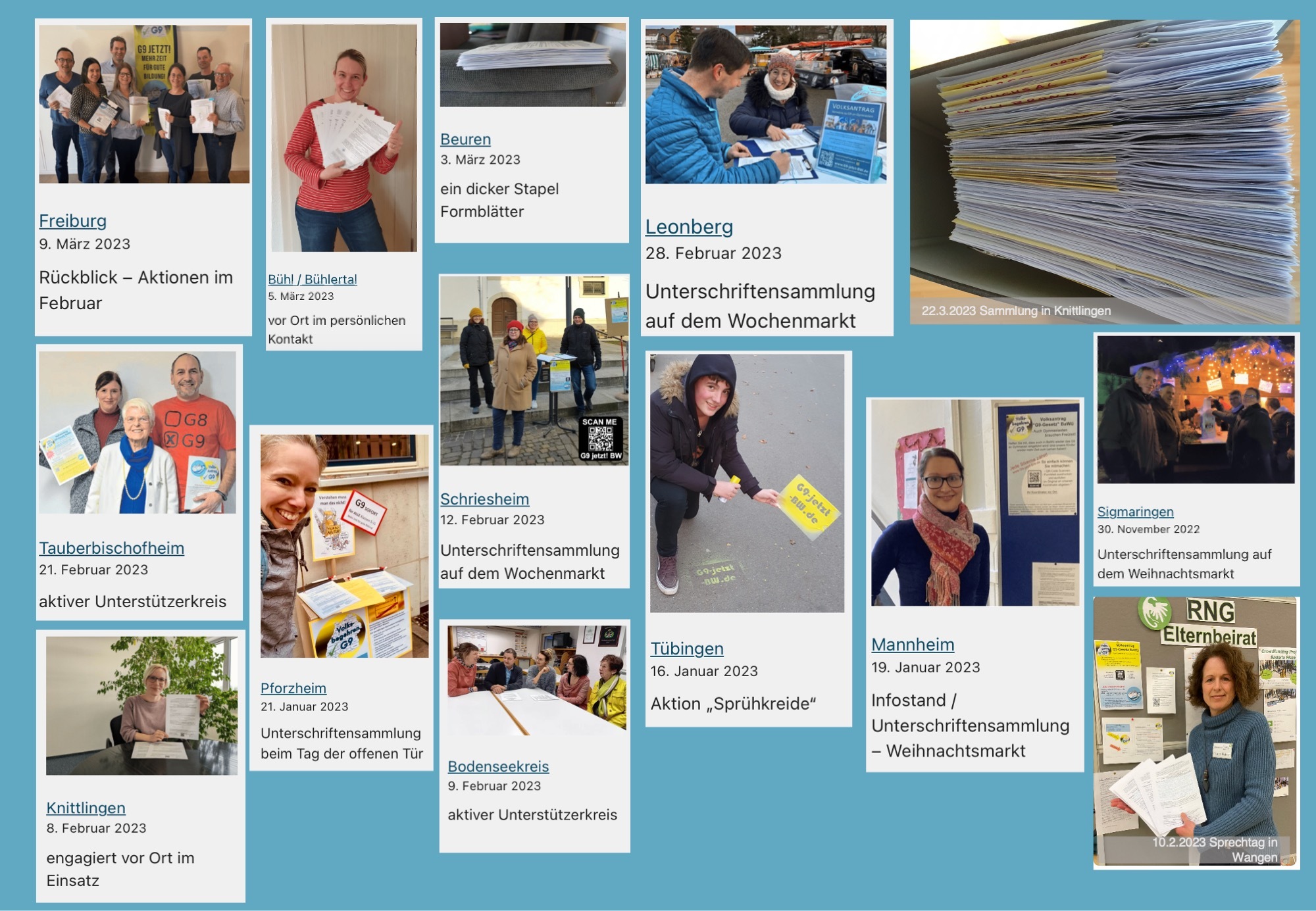 Möchten auch Sie uns beim Sammeln der Unterschriften unterstützen und sind noch nicht angemeldet, können Sie sich ebenfalls über unsere Website für den Newsletter in die Liste der Aktiven einschreiben: www.g9-jetzt-bw.de