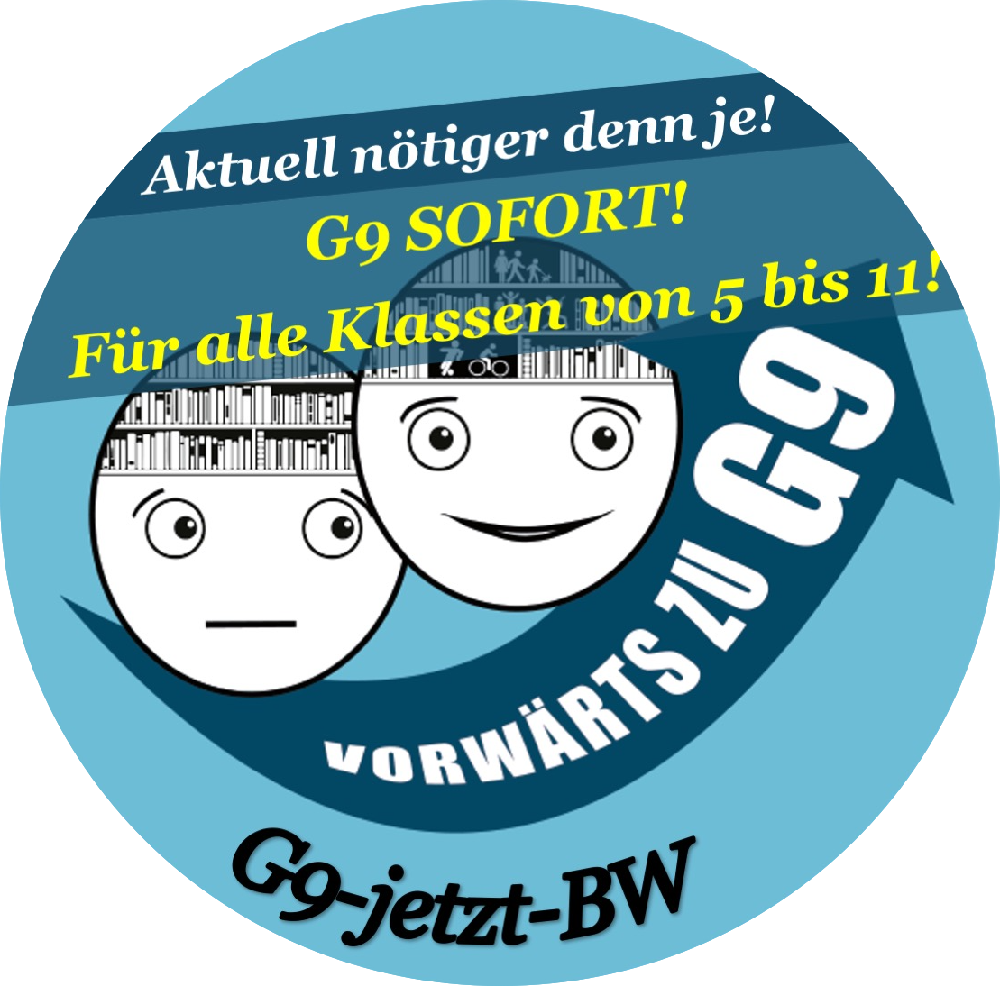 Es wäre doch toll, wenn man zunehmend auch in Warteschlangen beim Bäcker, in S-Bahn und Supermarkt oder sogar in den Schulen durch den Blick in das Gesicht der Mitmenschen auf unser Anliegen aufmerksam werden würde – und sich als Befürworter des G9 erkennt!