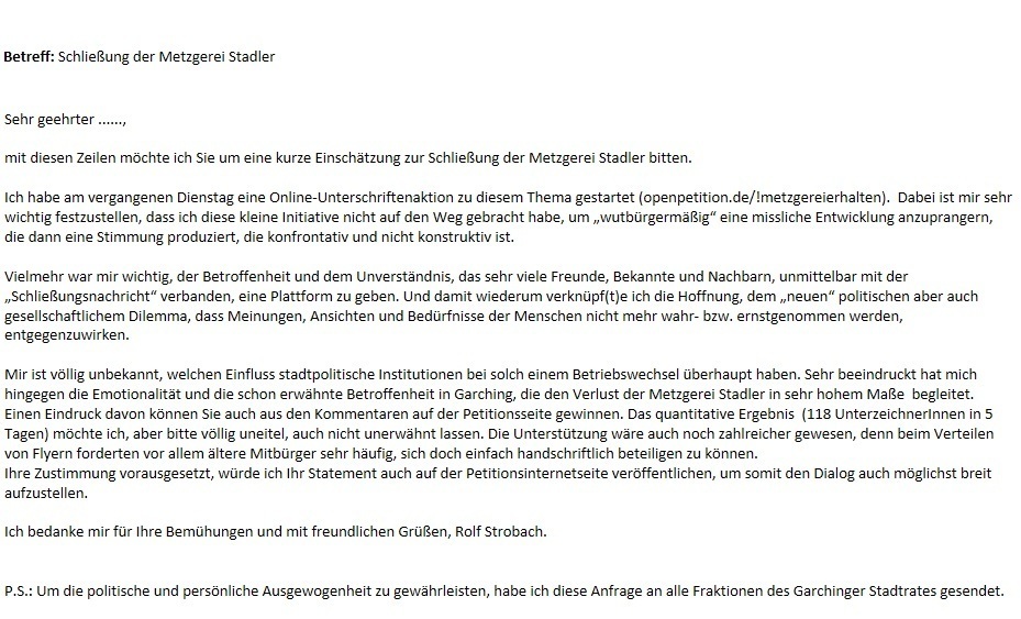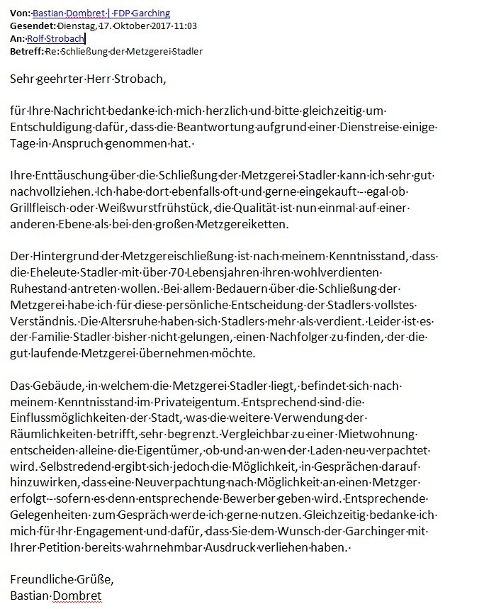 Das Gebäude, in welchem die Metzgerei Stadler liegt, befindet sich nach meinem Kenntnisstand im Privateigentum. Entsprechend sind die Einflussmöglichkeiten der Stadt, was die weitere Verwendung der Räumlichkeiten betrifft, sehr begrenzt. Vergleichbar zu einer Mietwohnung entscheiden alleine die Eigentümer, ob und an wen der Laden neu verpachtet wird. Selbstredend ergibt sich jedoch die Möglichkeit, in Gesprächen darauf hinzuwirken, dass eine Neuverpachtung nach Möglichkeit an einen Metzger erfolgt - sofern es denn entsprechende Bewerber geben wird. Entsprechende Gelegenheiten zum Gespräch werde ich gerne nutzen. Gleichzeitig bedanke ich mich für Ihr Engagement und dafür, dass Sie dem Wunsch der Garchinger mit Ihrer Petition bereits wahrnehmbar Ausdruck verliehen haben.