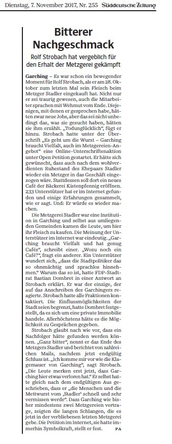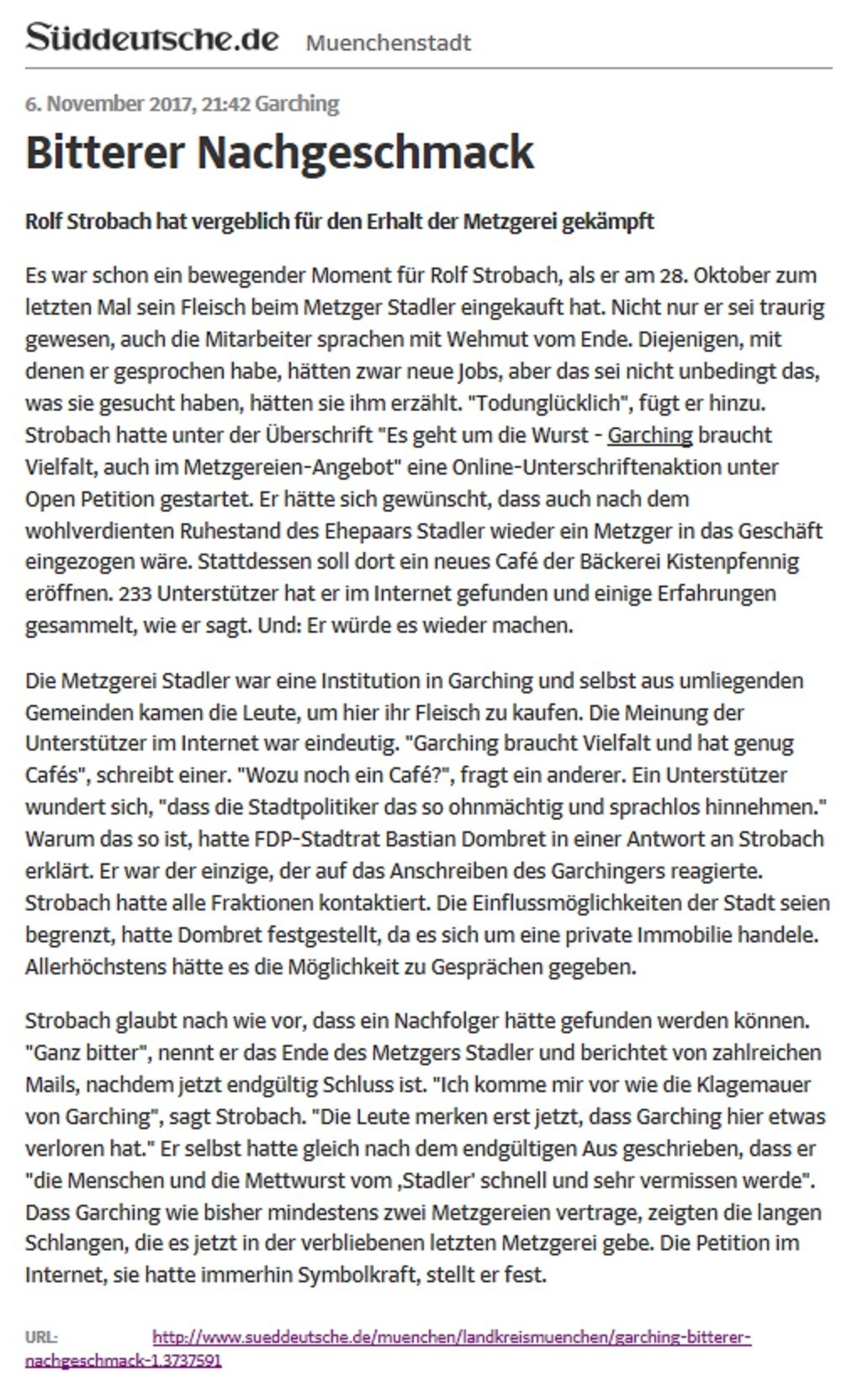 Ihre Enttäuschung über die Schließung der Metzgerei Stadler kann ich sehr gut nachvollziehen. Ich habe dort ebenfalls oft und gerne eingekauft - egal ob Grillfleisch oder Weißwurstfrühstück, die Qualität ist nun einmal auf einer anderen Ebene als bei den großen Metzgereiketten.