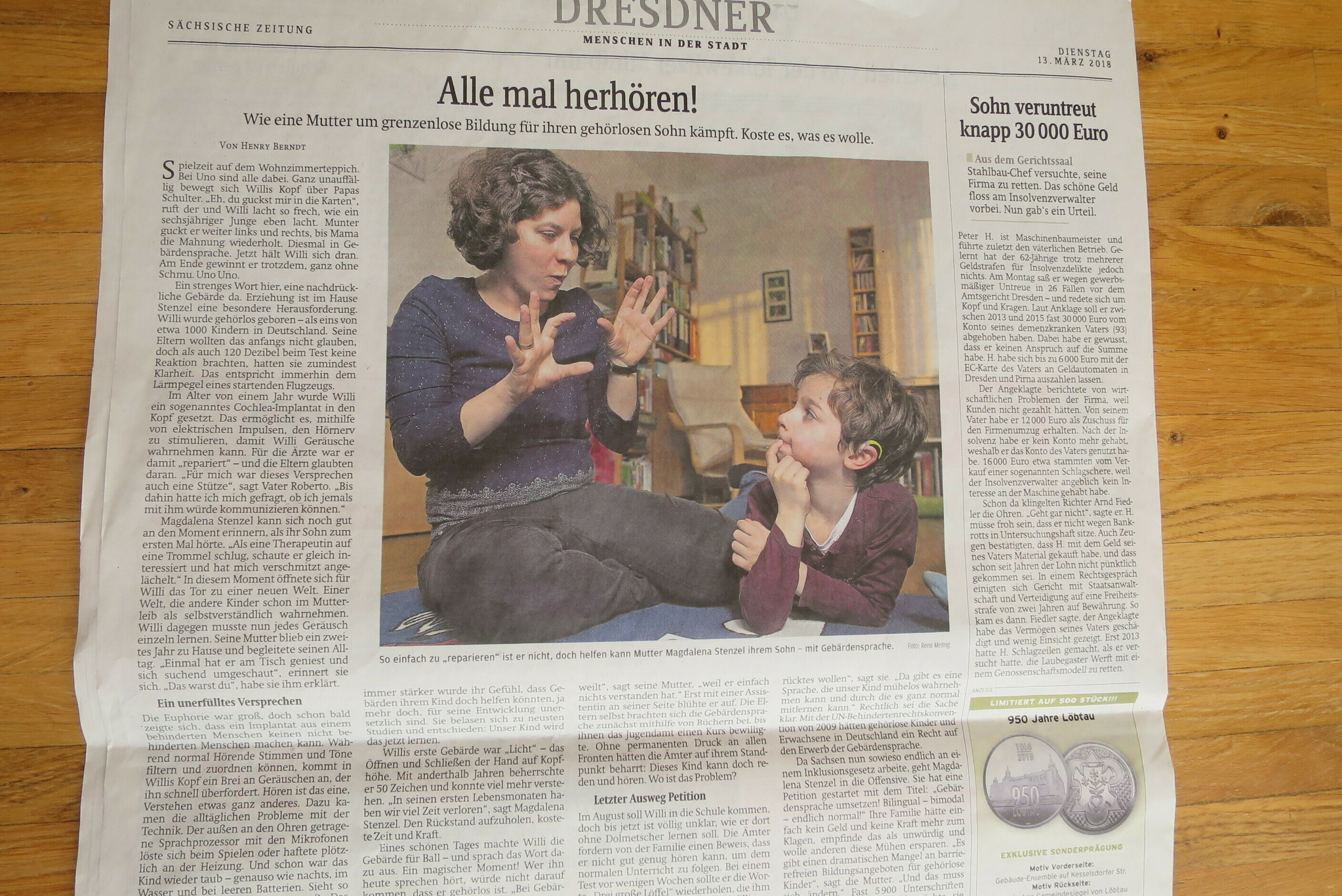 In Sachsen-Anhalt kam es inzwischen zu einem erfolgreichen Urteil - pro Hausgebärdensprachkurs für Eltern! Ein riesiges Dankeschön an die ausdauernde und mutige Familie und an Prof. Gisela Szagun. Prof. Szagun hat im Laufe der Petition für diese Verfahren eine sprachwissenschaftliche Stellungnahme verfasst. Nun kommt der Erfolg vielen Eltern tauber Kinder zu Gute – die nun ein konkretes Urteil in der Hand haben, wenn sie Gebärdensprachunterricht beim Jugendamt beantragen. Für das Kind muss der Antrag beim Sozialamt oder der Sozialagentur gestellt werden.