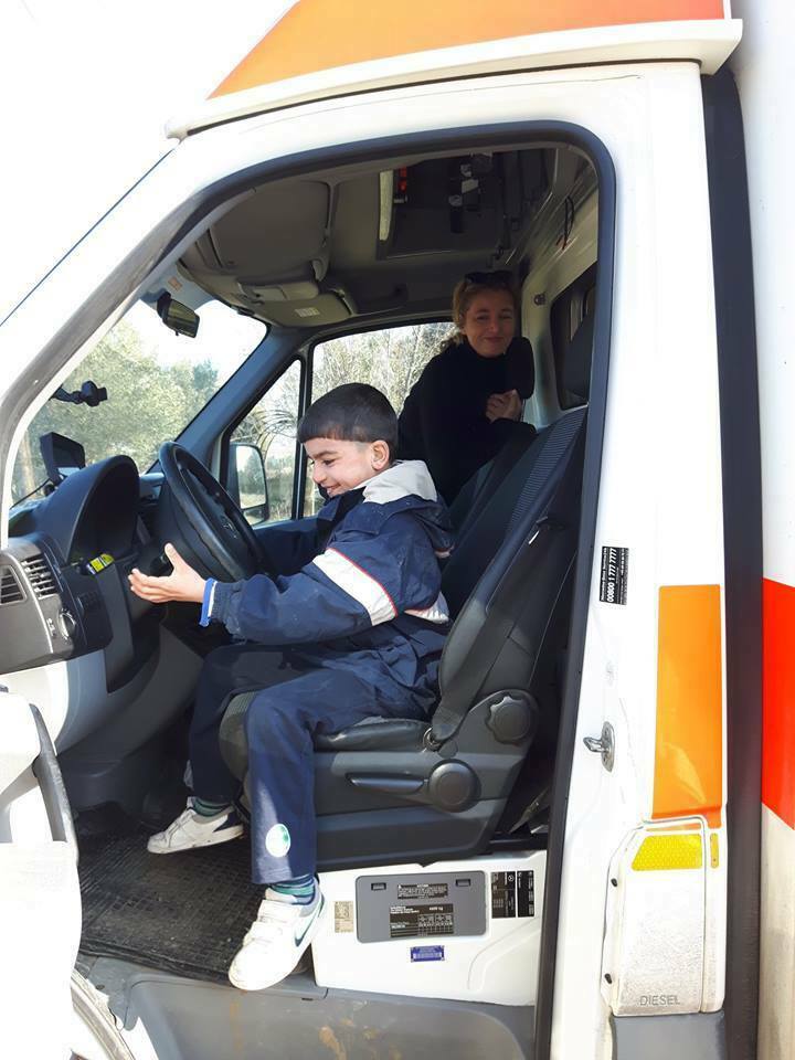 Zum Abschied senden wir Euch ein Bild von unserem Rettungswagen im Einsatz in Griechenland. Die Kinder sitzen gern am Steuer. Eines Tages werden sie unsere Welt retten.