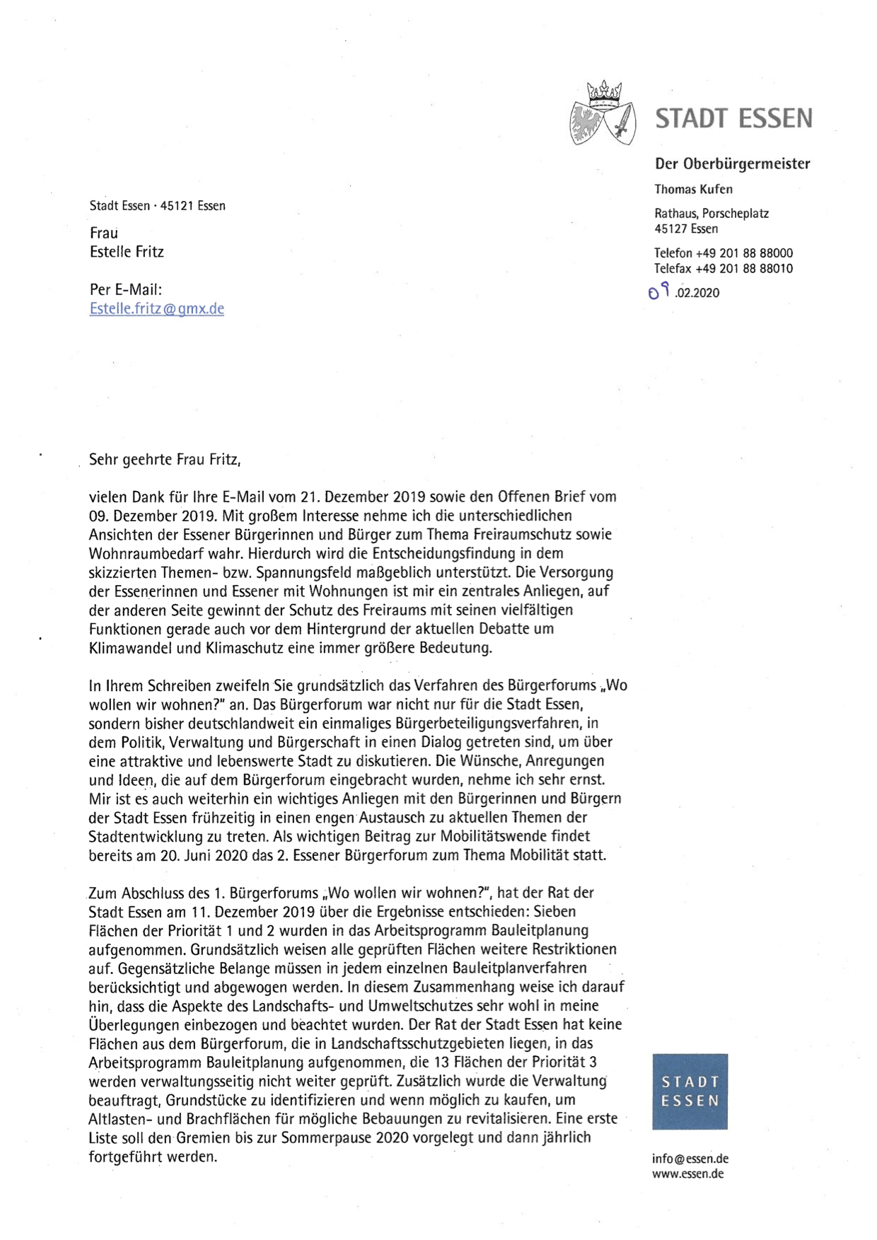 8 Bürger-Initiativen essenweit - darunter auch "Rettet Rüttenscheid" gegen die Bebauung auf dem Messeparkplatz -, hatten stellvertretend für fast 17.000 gesammelte Unterschriften, am 09.12.2019 einen 4seitigen, Offenen Brief an OB Kufen verfasst. Zu den 17.000 Unterschriften zählen auch Eure, aus dieser Petition.
