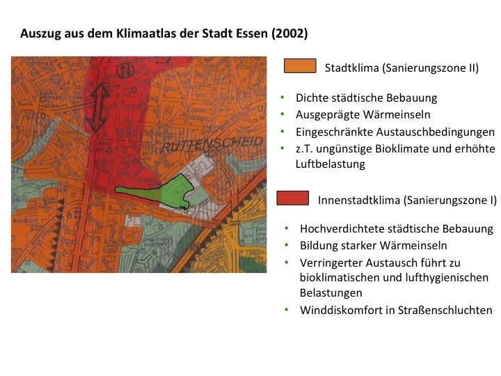 Bei Ihren Lösungsvorschlägen zu den 9 Begründungspunkten der Petition bitte ich Sie zudem, die Ergebnisse des Klimaatlas Essen (aus dem Jahre 2002) mit zu berücksichtigen (s. Ausschnitt Anlage) und zu erläutern, wie Sie dieses offensichtlich eklatante Defizit auszugleichen gedenken.