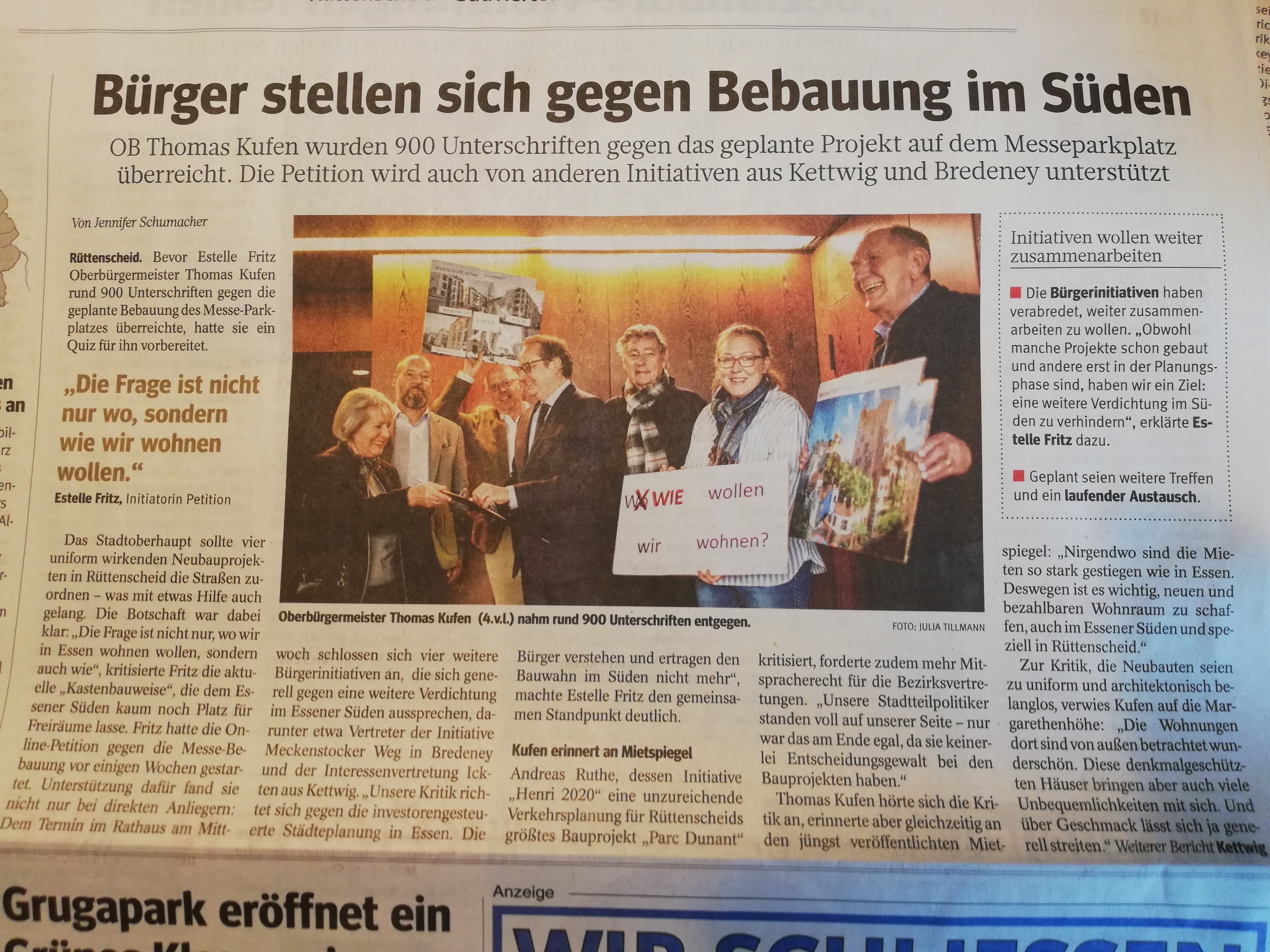 Es ist vollbracht! Gestern wurden die fast 900 Unterschriften an OB Kufen übergeben und die WAZ berichtet heute darüber (s. Anlage). Als sehr positives Signal habe ich bei dem Termin empfunden, dass Herr Kufen den von mir vorgeschlagenen Wunschtermin zugesagt hat. Der Termin – und das war Herr Kufen bewusst - war nämlich gezielt gewählt: vor der Ratssitzung in der die Ergebnisse des Bürgerforums „Wo wollen wir wohnen“ im Rat präsentiert und besprochen werden sollten. Mit dem Petitionsergebnis, den darin formulierten Forderungen und Euren Kommentaren ausgestattet, konnte Herr Kufen daher in die Ratssitzung gehen. Es wurden wahnsinnig viele Themen angesprochen bei Herrn Kufen und der Artikel kann daher nur einen Ausschnitt wieder geben, doch die Kernaussagen wurden eingebracht: nämlich, dass die aktuelle Wohnbaupolitik in Essen absolut investorengesteuert ist und eine bewusste und konstruktive Stadtentwicklung bzw. Stadtplanung aktuell gar nicht stattfindet. Und, dass die unterste politische Ebene, die Bezirksvertretung, welche eigentlich die Stimmungen, Anliegen und Bedürfnisse der BürgerInnen aus den entsprechenden Stadtteilen in den „Politik- und Verwaltungsapparat“ trägt, nicht mehr gehört wird.