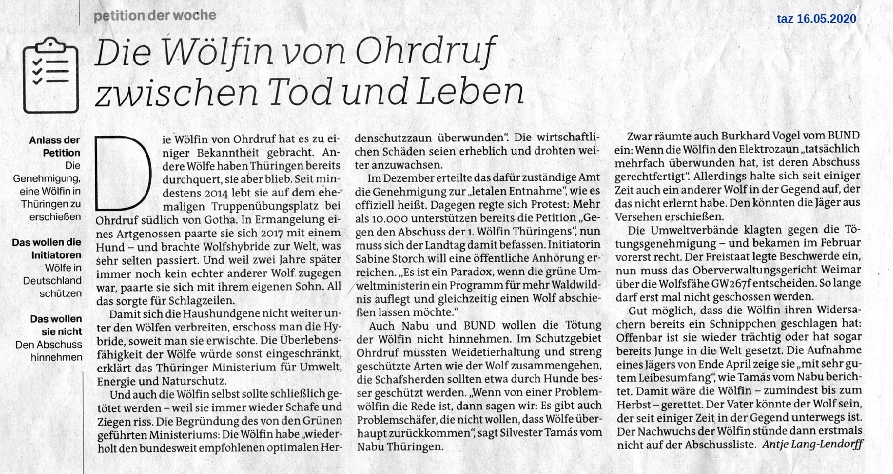 In vier Tagen endet die Frist zur Unterzeichnung unserer Petition gegen den Abschuss der Ohrdrufer Wölfin. Es sind aktuell 2.856 Unterschriften aus Thüringen, und 9.803 Unterschriften insgesamt. Vielen Dank!