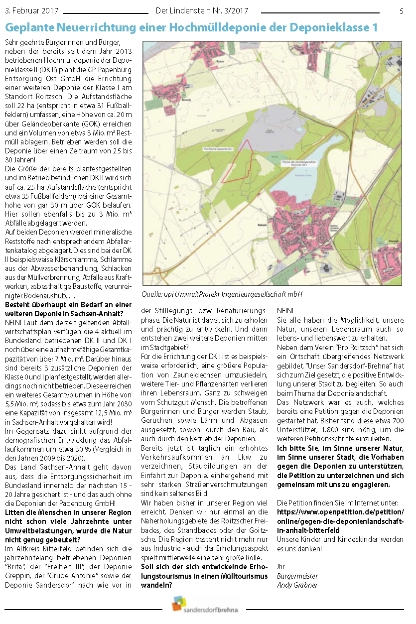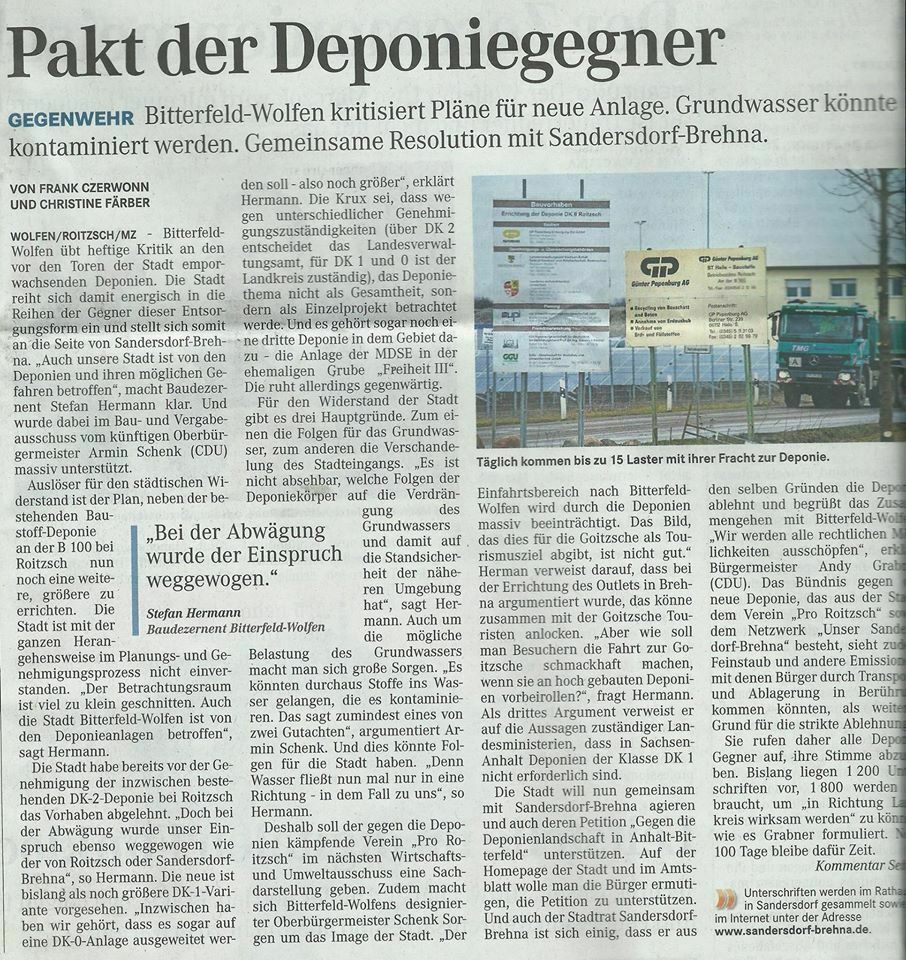 Das Netzwerk „Unser Sandersdorf-Brehna“ startete die Petition „Gegen die Deponienlandschaft in Anhalt-Bitterfeld“. Bisher fanden sich fast 1.200 Unterstützer, 1.800 werden benötigt, um weitere Petitionsschritte einzuleiten. Unterschriften werden im Rathaus in Sandersdorf gesammelt sowie unter www.sandersdorf-brehna.de.
