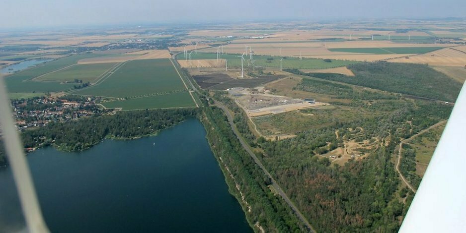 Das Luftbild zeigt die Bundesstraße mit Blickrichtung Südwest. Links liegt die Roitzscher Grube, rechts entsteht die neue Deponie.