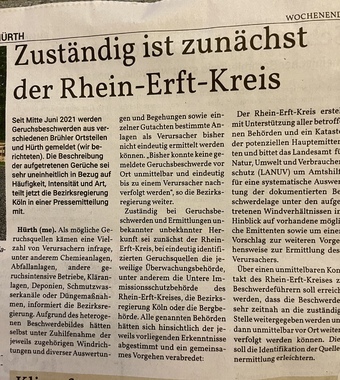 Seit Mitte Juni 2021 werden Geruchsbeschwerden aus verschiedenen Brühler Ortsteilen und Hürth gemeldet. Die Beschreibung der aufgetretenen Gerüche ist sehr uneinheitlich in Bezug auf Häufigkeit, Intensität und Art.