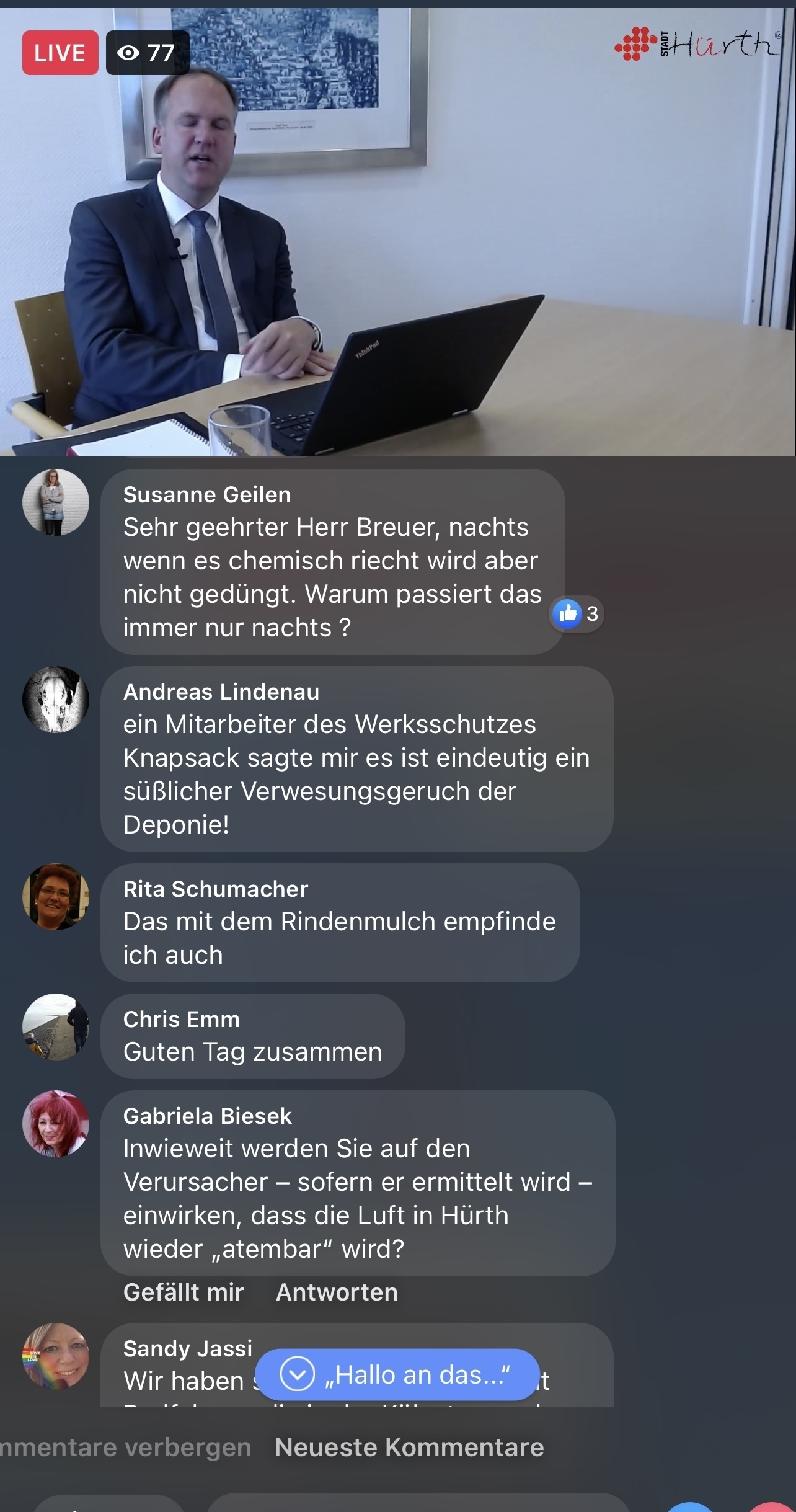 Die Fragen konnte man online stellen. Auf das Problem „Gerüche“ kam er als Erstes zu sprechen. Die ausgesuchten Fragen wurden durch die Kulturdezernentin vorgelesen. Dazu habe ich Euch einen Screenshot beigefügt.