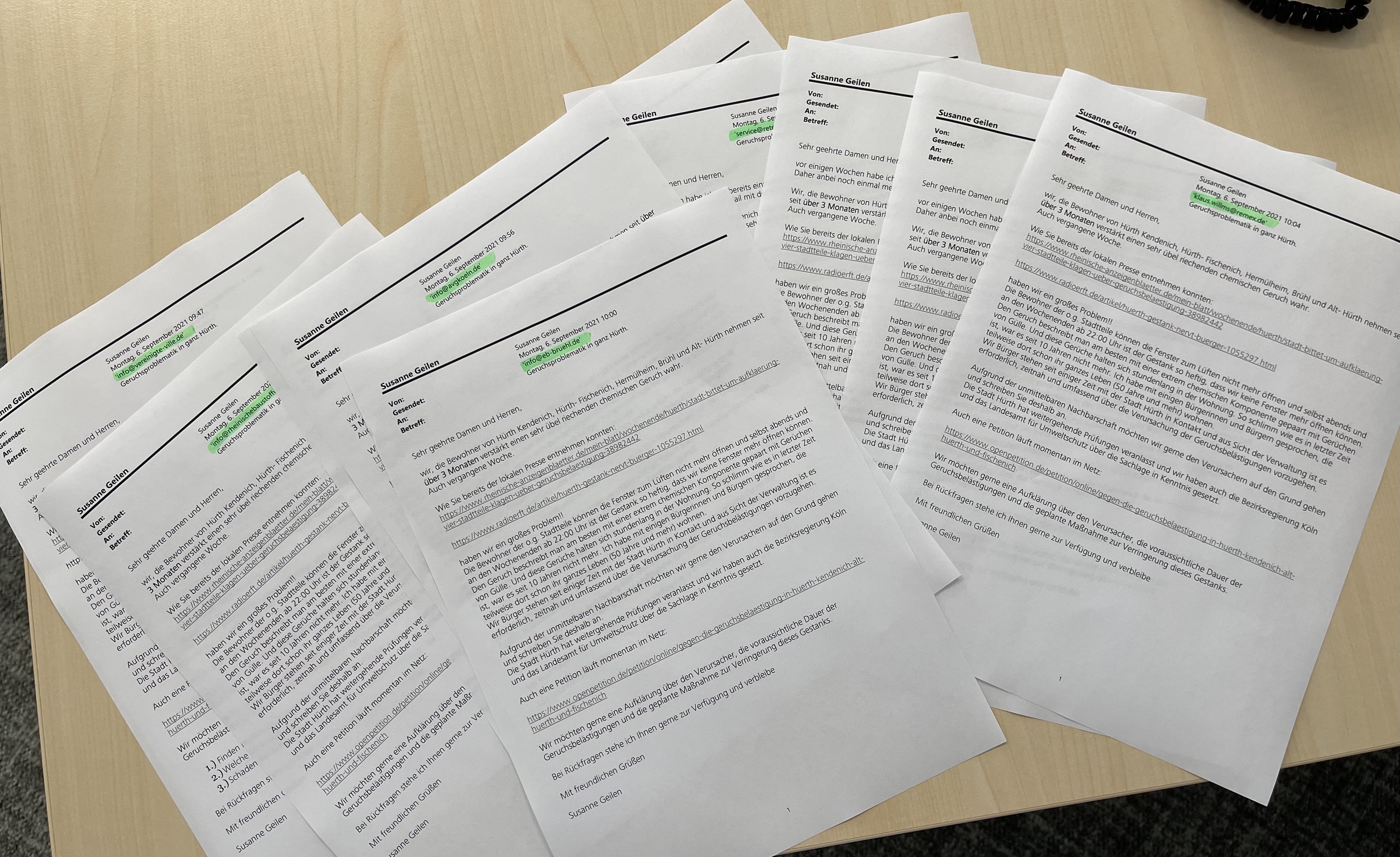 Servicestelle beim Bürgermeister Hürth (LFeiser@huerth.de) sammelt dort Beschwerden und bindet dann die Betreiber aus dem ChemPark und auch die Deponiebetreiber bei der Aufklärung mit ein.