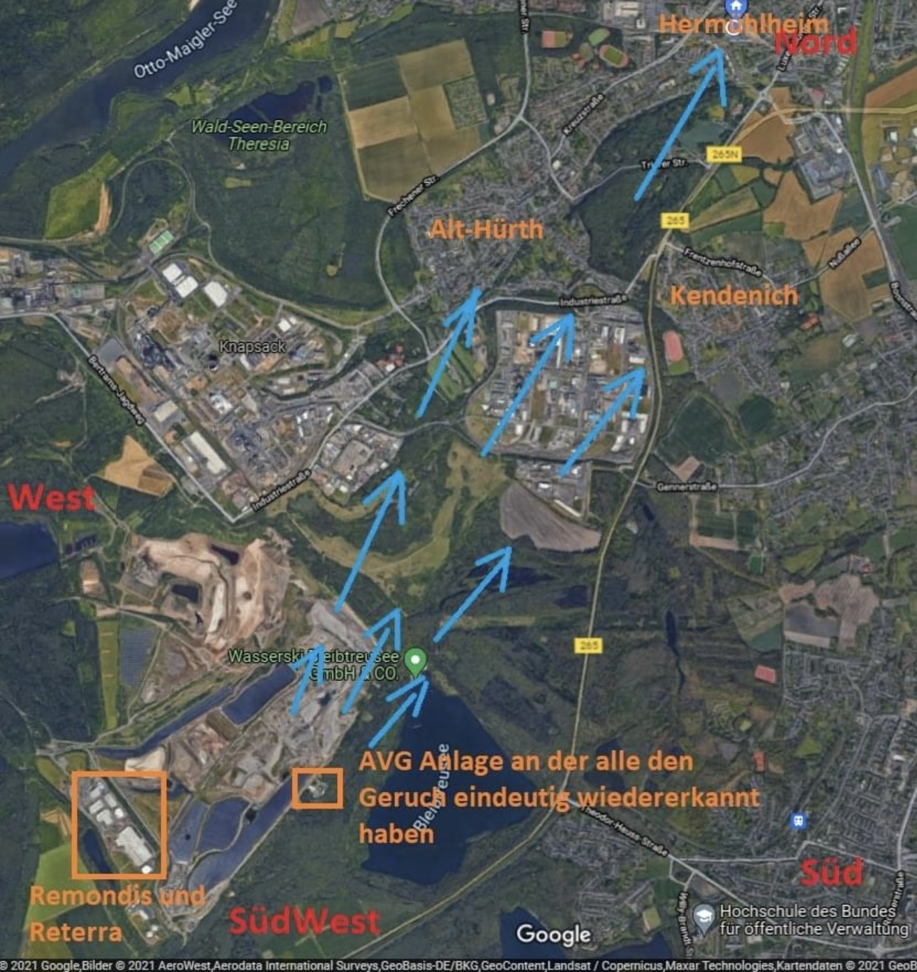 Wir für unseren Teil gehen stark davon aus, dass die Gasanlage der AVG die Quelle sein könnte, denn wenn es eine Firma aus Knapsack wäre, hätten wir sonst alle in dieser Senke, genau dort wo die AVG Anlage steht, genau dort diesen Geruch wahrnehmen müssen. Es kann bei Windrichtungen Süd, Südwest, und West an den Stellen der Remondis und Reterra nichts Riechbares geben, da die AVG- Anlage nordöstlich davon liegt und bei der Windrichtung der Geruch von Remondis und Reterra weggeweht wird. Daher war dort gestern Abend auch nichts zu riechen, denn eine Bürgerin ist mit Frau Heuckeroth sofort rausgefahren.
