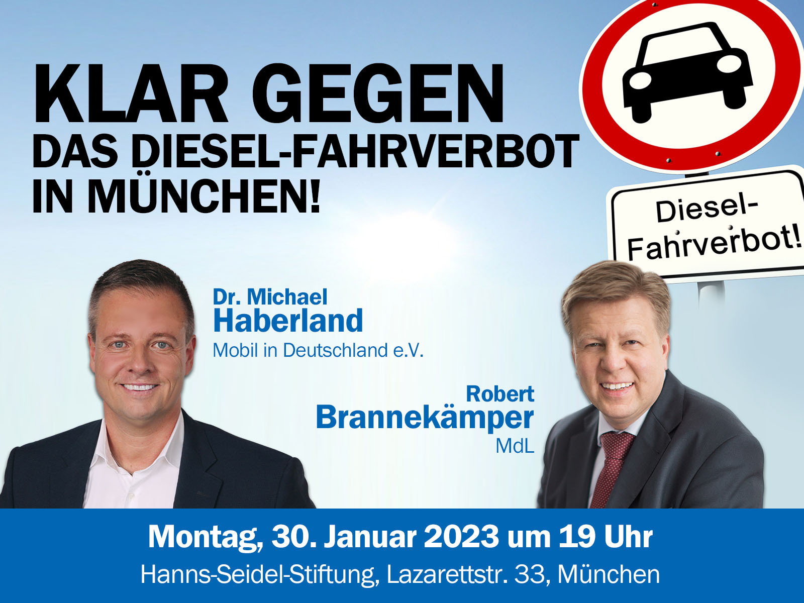 Wir möchten Sie daher herzlich zur zweiten Veranstaltung zum Thema "Klar gegen das Diesel-Fahrverbot in München" einladen. An diesem Abend informieren und diskutieren Robert Brannekämper, MdL, Dr. Michael Haberland, Präsident vom Automobilclub Mobil in Deutschland e.V. und Rechtsanwalt Dr. Claus-Peter Martens zu dem bevorstehenden Diesel-Fahrverbot in München und wie man dies verhindern kann. Zudem zeigen wir auf, wie sich jeder Einzelne wehren kann.