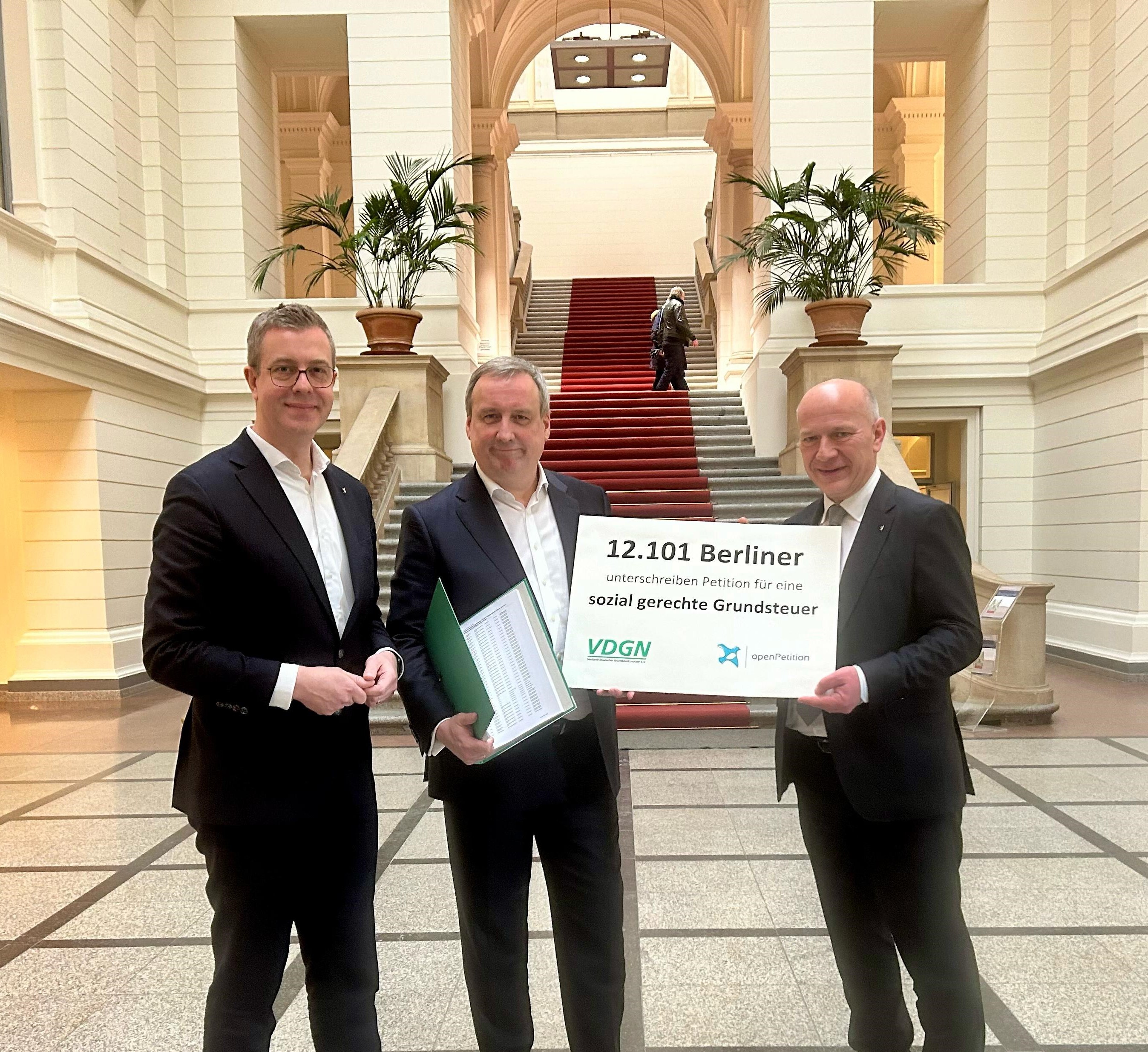 VDGN-Präsident Jochen Brückmann hat heute die Unterschriftenlisten im Berliner Abgeordnetenhaus Berlins Regierenden Bürgermeister Kai Wegner und Finanzsenator Stefan Evers übergeben und erklärte dazu „Die erfolgreiche Petition ist ein eindrucksvolles Votum dafür, dass der Berliner Senat und das Abgeordnetenhaus nun handeln müssen. Mit der Grundsteuerreform drohen Eigenheimern und anderen privaten Haushalten ab dem kommenden Jahr deutliche Mehrbelastungen. Das Land Berlin kann die Grundsteuerlasten über die Steuermesszahl und den Hebesatz immer noch anpassen. Es ist also noch Zeit, die Grundsteuererhöhungen abzufedern.“