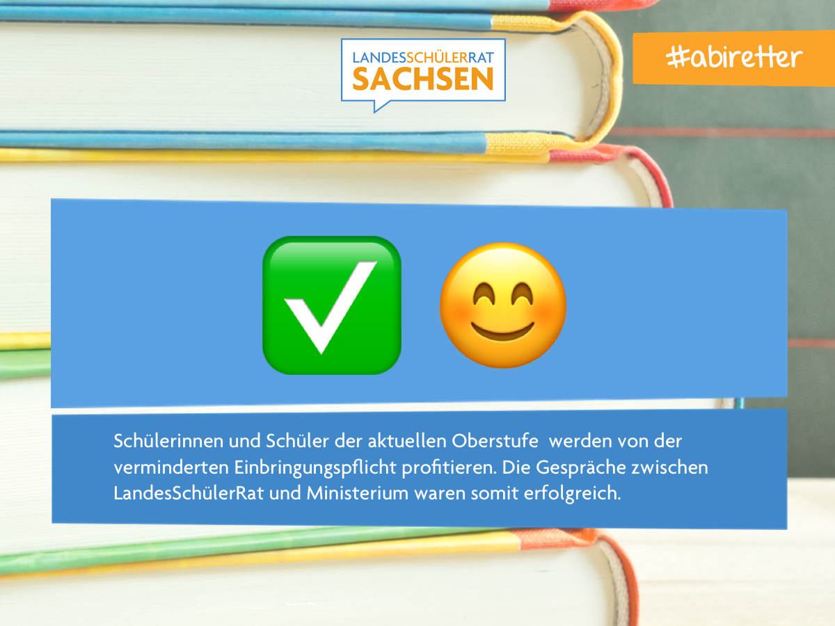 Die sofortige Auflockerung der Einbringungspflicht ist offiziell. Kultusministerin Brunhild Kurth hat sich am Donnerstag nach Rücksprache mit dem LandesSchülerRat in der Freitagsausgabe der Leipziger Volkszeitung geäußert und sich zur Umsetzung der Forderung dieser Petition entschieden. #abiretter - SCHÜLERMITWIRKUNG WIRKT!